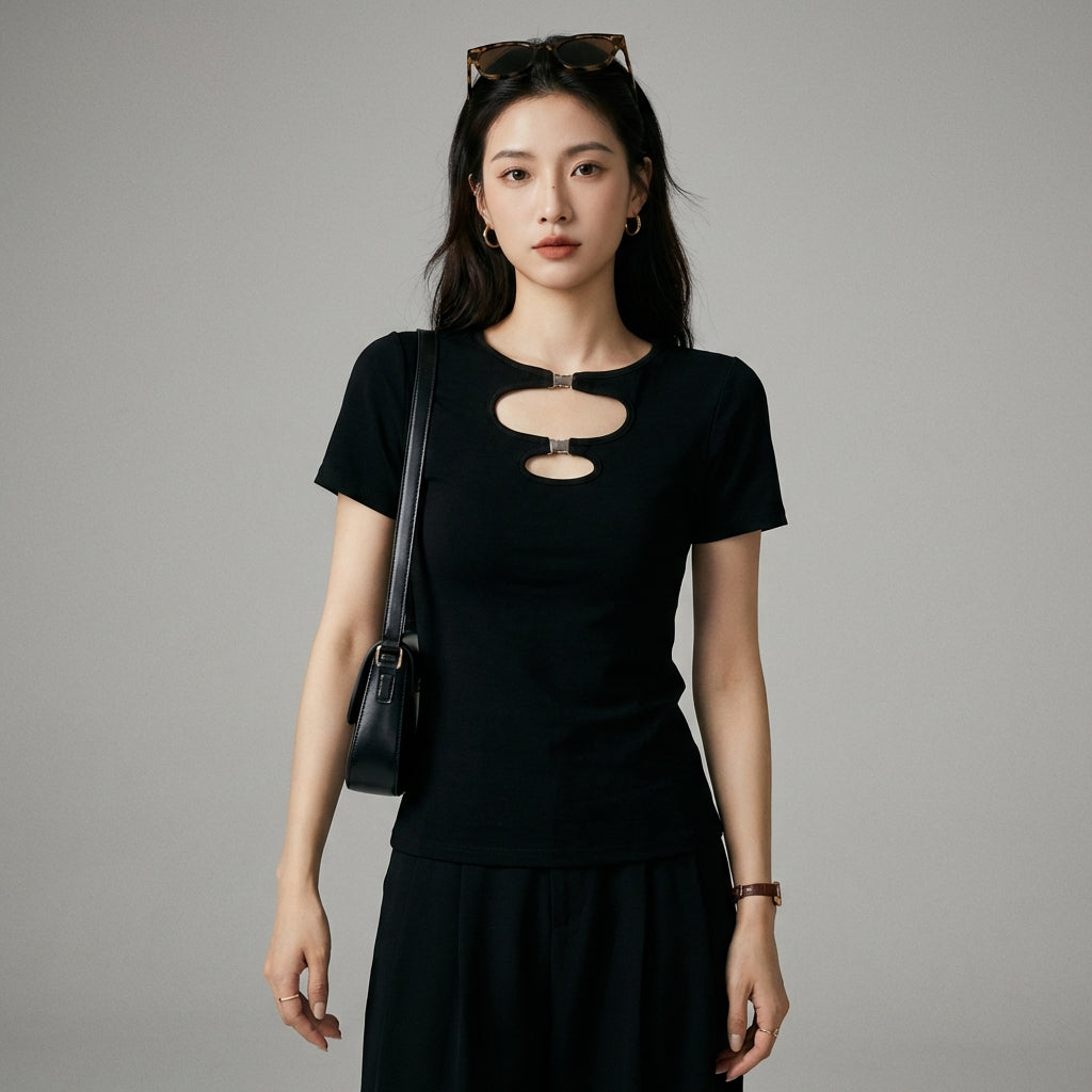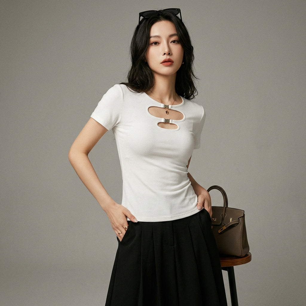 Afferma il tuo stile con la nostra t-shirt corta cut-out, un must-have per un look audace e di tendenza. Il suo design traforato aggiunge un tocco di sensualità discreta, perfetta per le giornate di sole o le serate estive! ✨