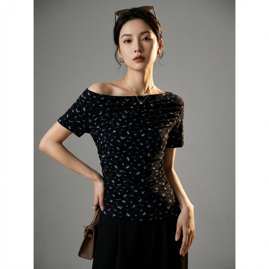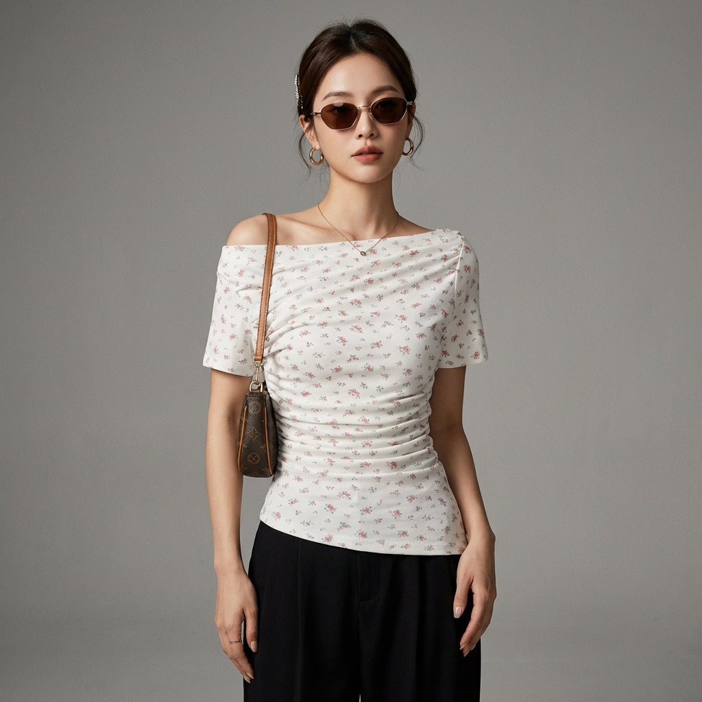 Afferma il tuo stile con questa t-shirt unica a maniche corte e il suo delicato design floreale. Il suo taglio slim e il collo asimmetrico scoperto donano un tocco di freschezza e morbidezza, ideale per tutte le occasioni! 🌸