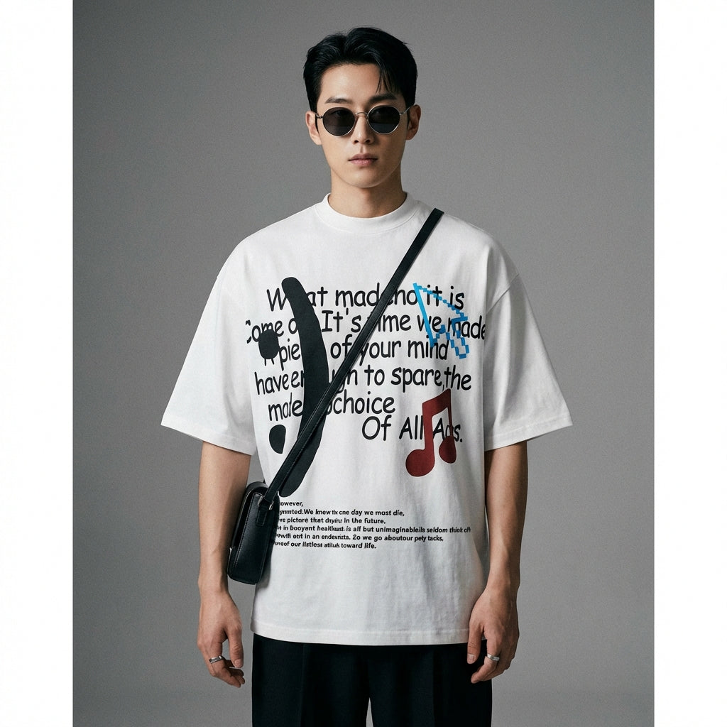 Afferma il tuo stile con la nostra T-shirt oversize, perfetta per un look casual e di tendenza. La sua stampa unica di note musicali e lettere aggiunge un tocco di originalità al tuo guardaroba. Ideale per tutte le occasioni casual! 🎶
