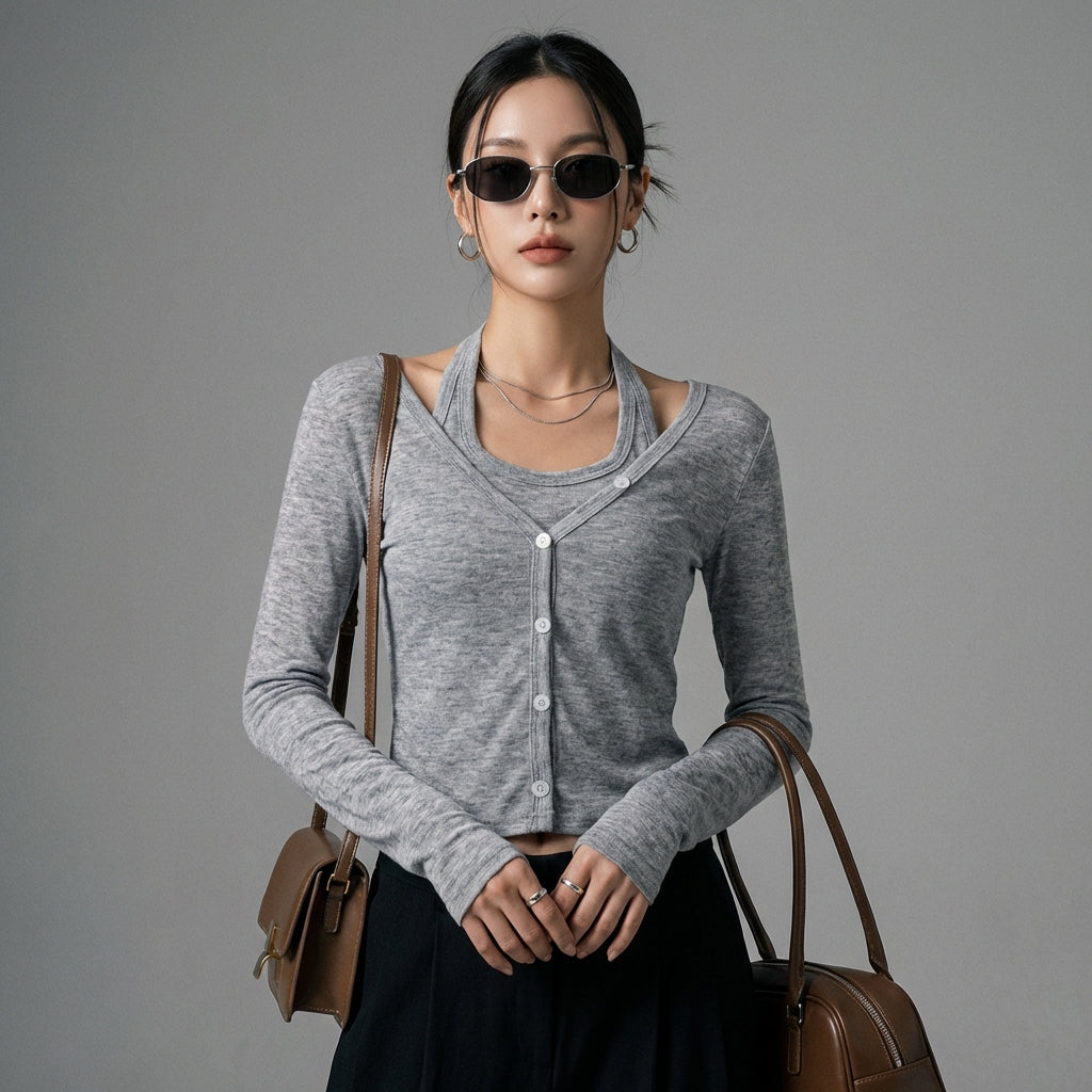 Adotta un look trendy e casual con il nostro top a maniche lunghe in maglia, progettato per dare l'illusione di un completo due pezzi. Il suo design pulito, impreziosito da un scollo a V e dettagli abbottonati, offre una silhouette slim e moderna, perfetta per tutte le occasioni! ✨