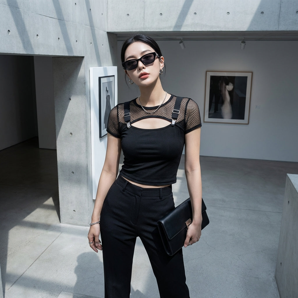 Afferma il tuo stile con il nostro top slim nero, un capo essenziale versatile e di tendenza. Il suo taglio aderente e i dettagli in maglia trasparente aggiungono un tocco audace e moderno a tutti i tuoi outfit, perfetto per un look da sera o un'allure streetwear chic! 🖤