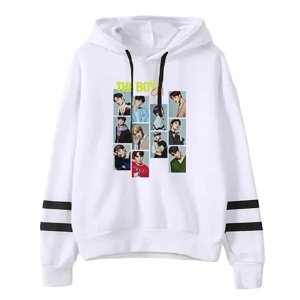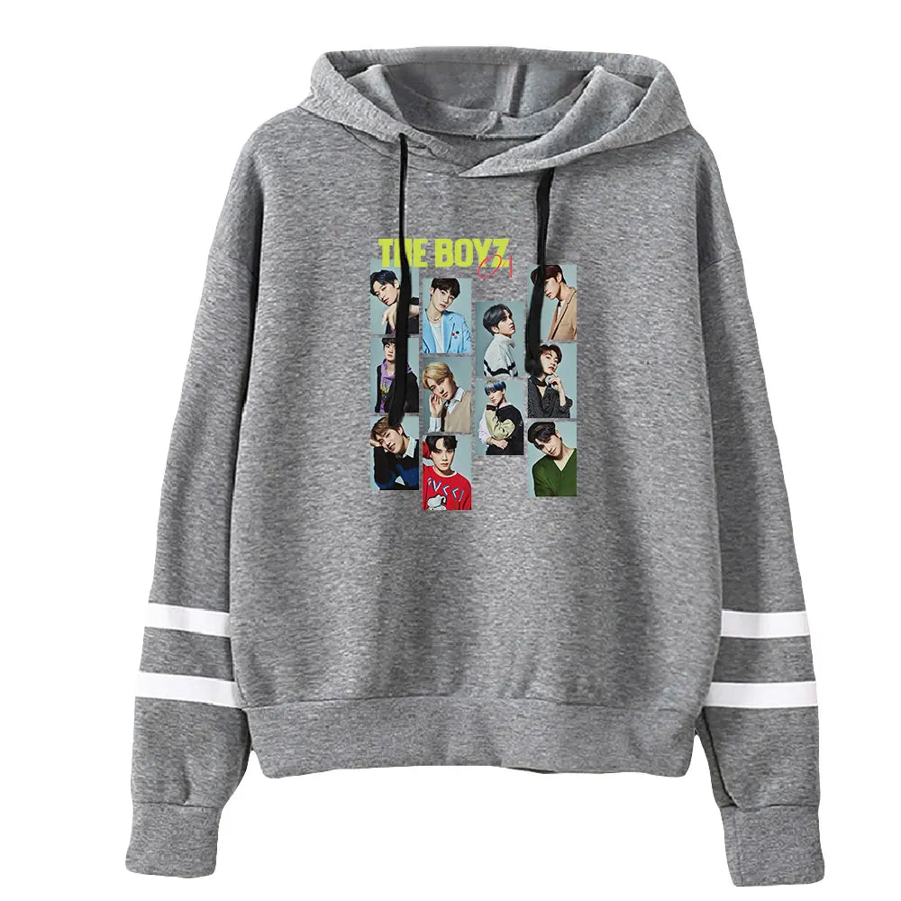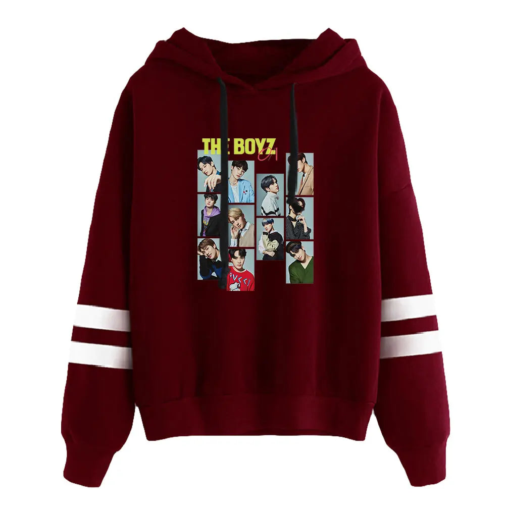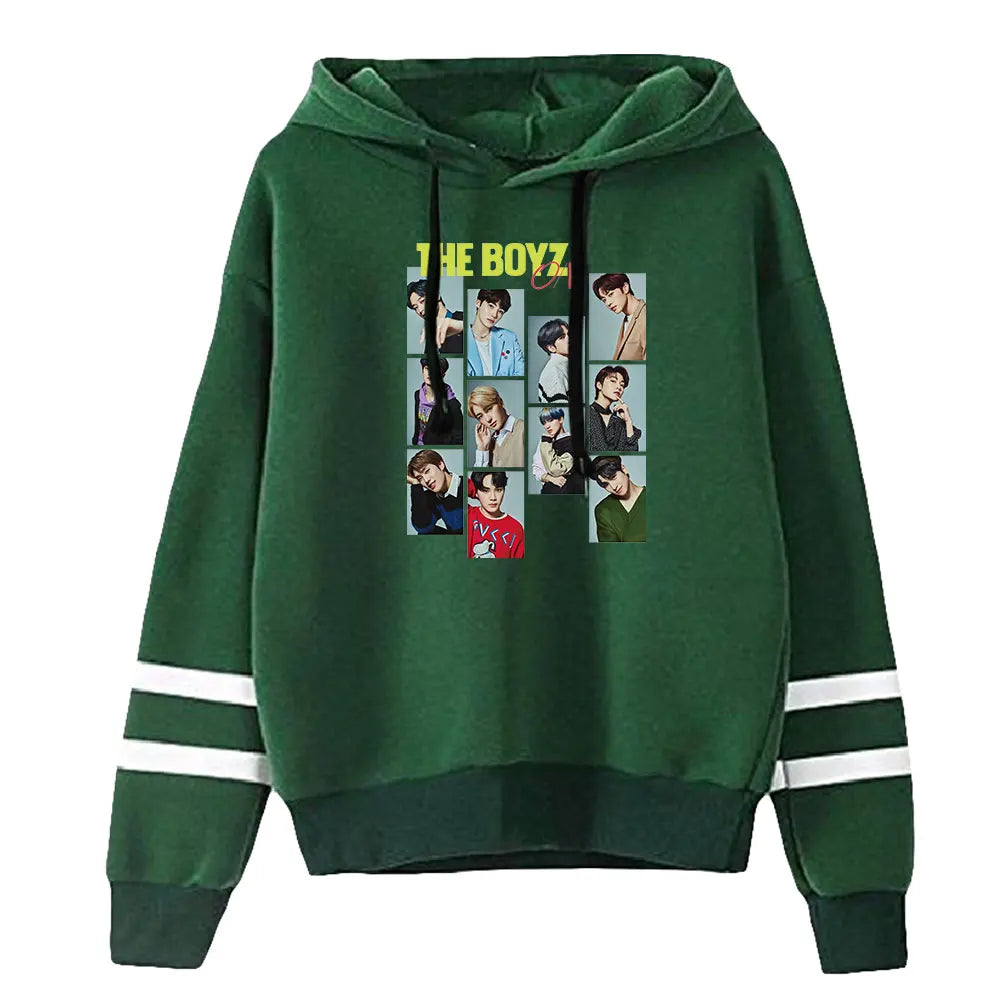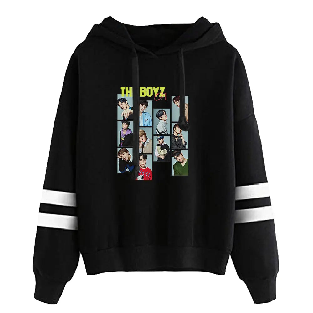 Eleva la tua collezione streetwear con la Felpa con Cappuccio 'The Boyz Collage', progettata per fare scalpore. Ogni elemento di questo capo riflette la sinergia e il carisma del gruppo The Boyz attraverso un sofisticato collage fotografico. Questa felpa con cappuccio è una celebrazione della cultura K-pop, perfetta per rimanere alla moda e comodi durante le stagioni più fresche.