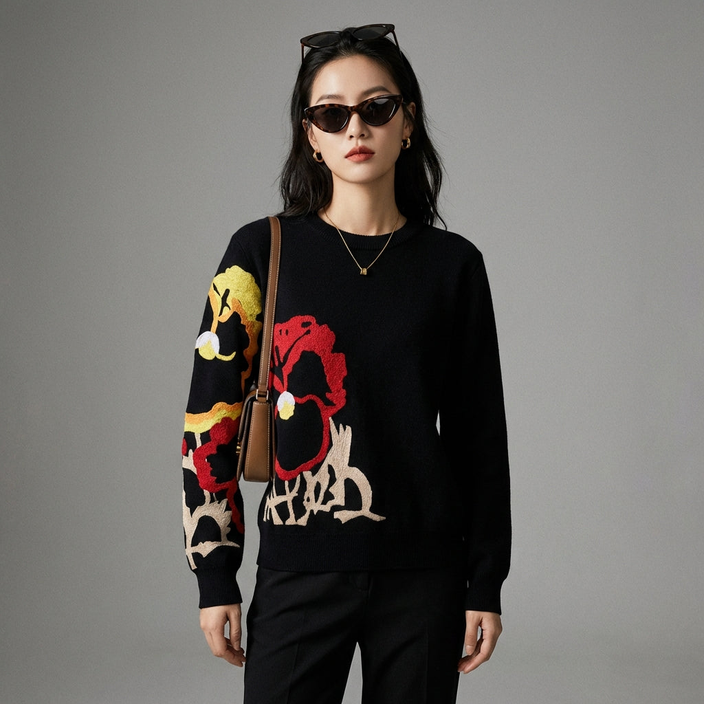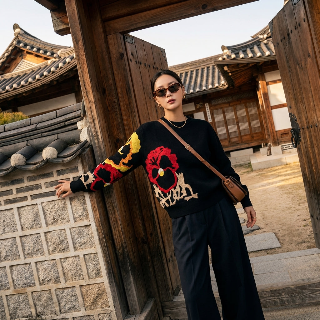 Questo maglione jacquard ricamato è il capo chiave per uno stile unico, che unisce comfort ed eleganza con un tocco di ispirazione coreana.