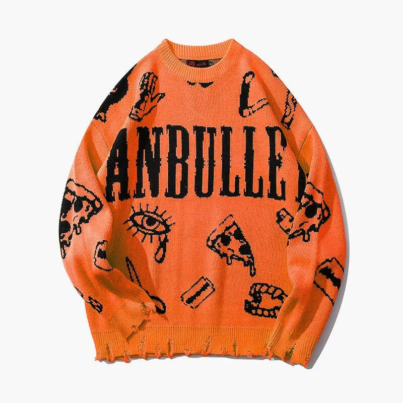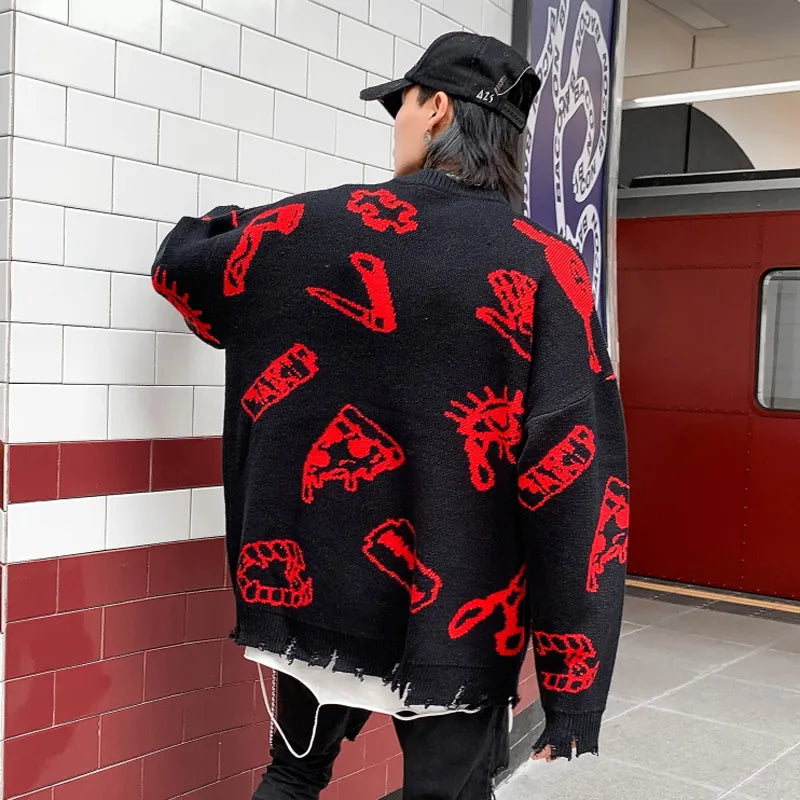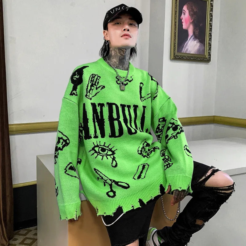 Stile: Punk Hip-Hop. Con strappi audaci e un design graffiti, questo maglione incarna uno spirito giovane e ribelle.