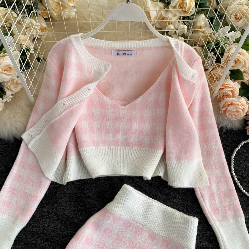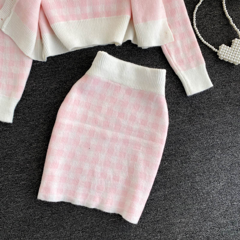 Il tessuto a quadri è molto morbido e confortevole. Inoltre, i quadri offrono uno stile riconoscibile in Corea del Sud. Il completo include una giacca, un crop top e una gonna.