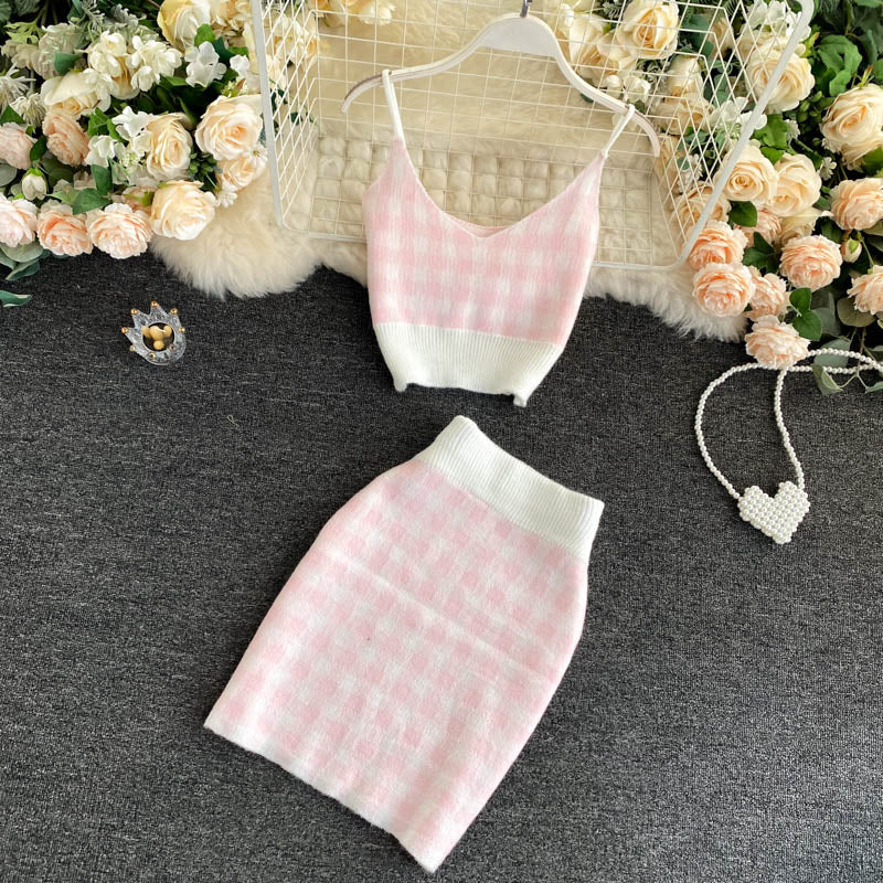 Se desideri adottare uno stile retrò e colorato con un outfit a quadri, questo completo coreano è perfetto per te. Scegli il rosa e il viola come emblema.