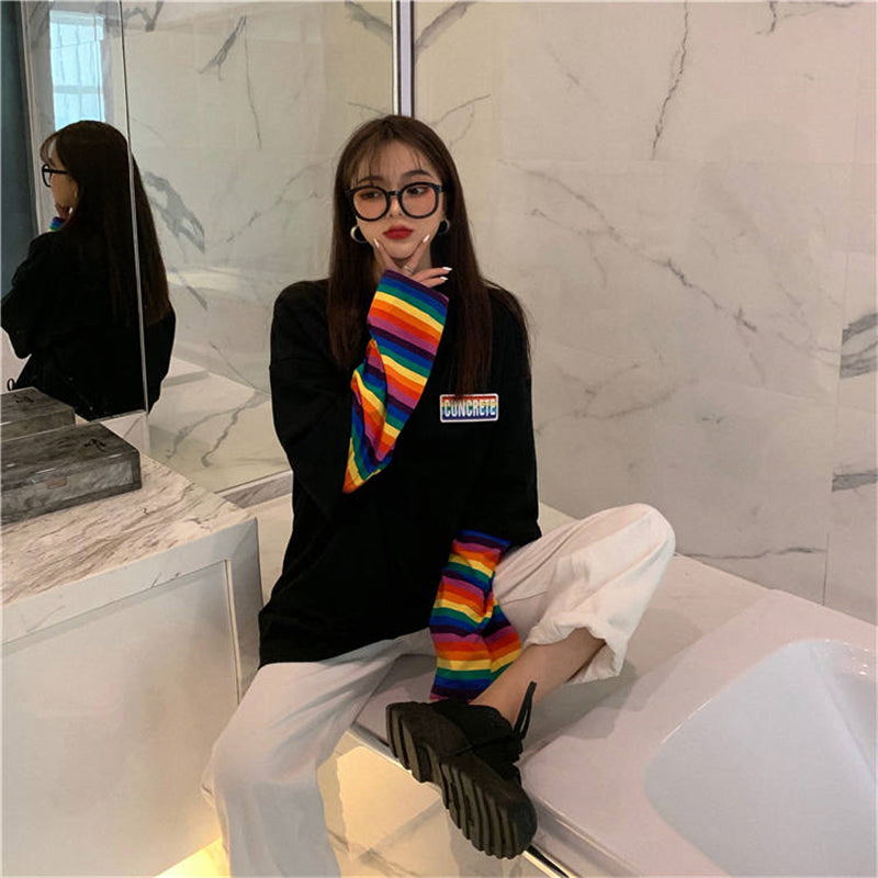Indossa una T-shirt a maniche lunghe nera o bianca con ricamo e maniche nei colori dell'arcobaleno. Il termine "concrete" che è ricamato sulla T-shirt significa "cemento".