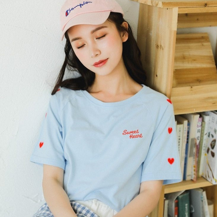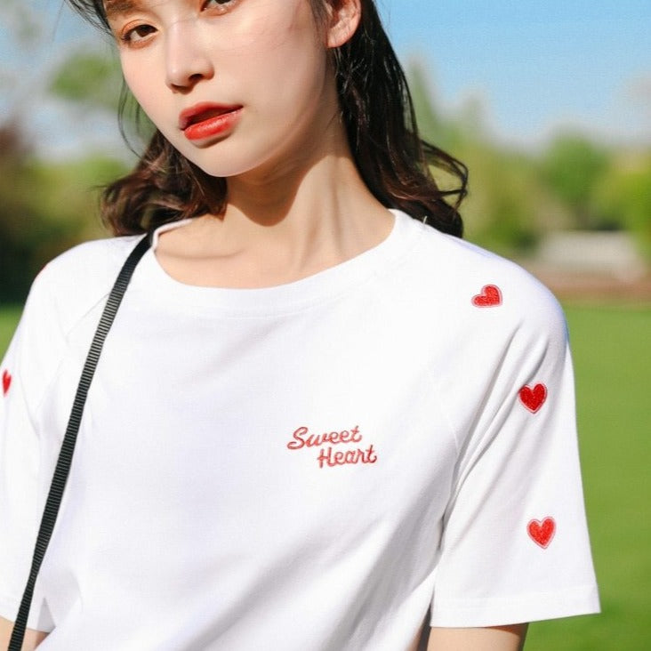 Questa T-shirt coreana a cuori ti offre uno stile carino. La scritta "Sweet Heart" è ricamata.