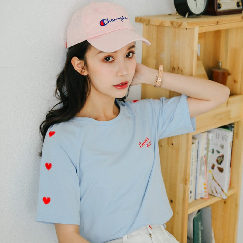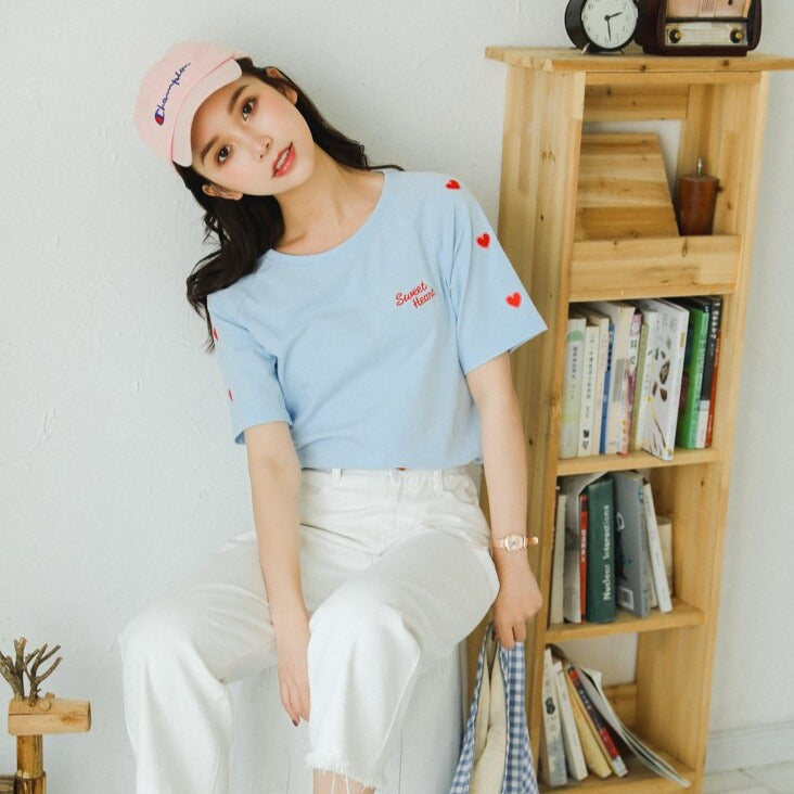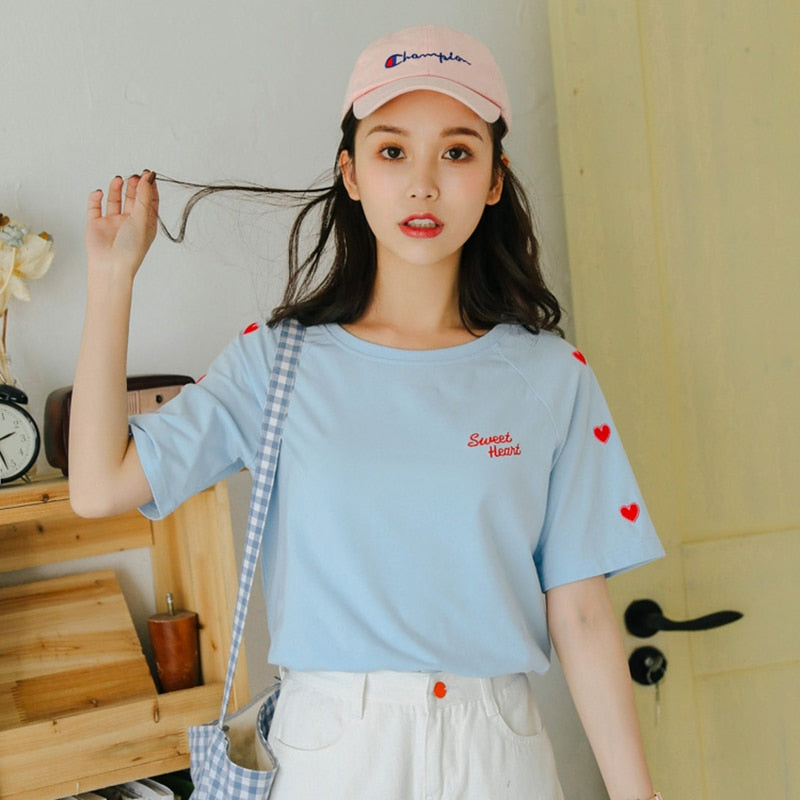 Se ti sei innamorato di questo magnifico paese, puoi da ora indossare la T-shirt morbida e comoda Sweet Heart. La moda coreana carina è davvero graziosa.