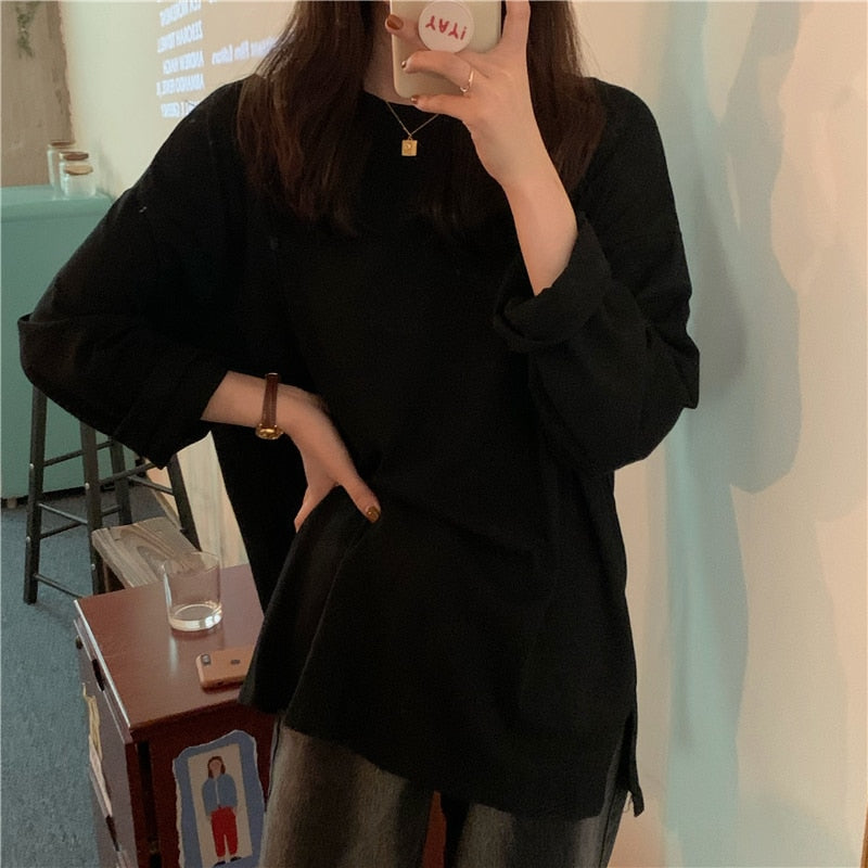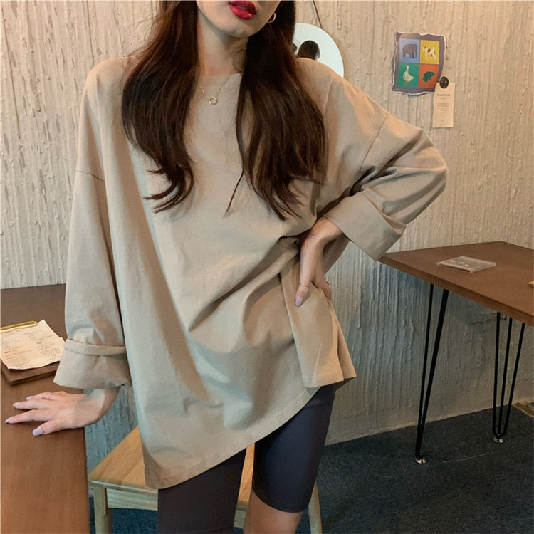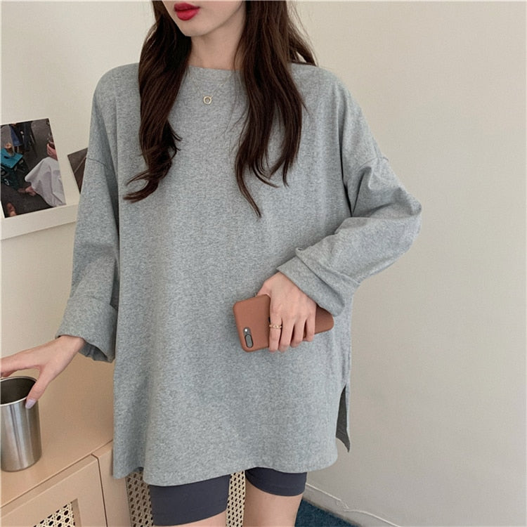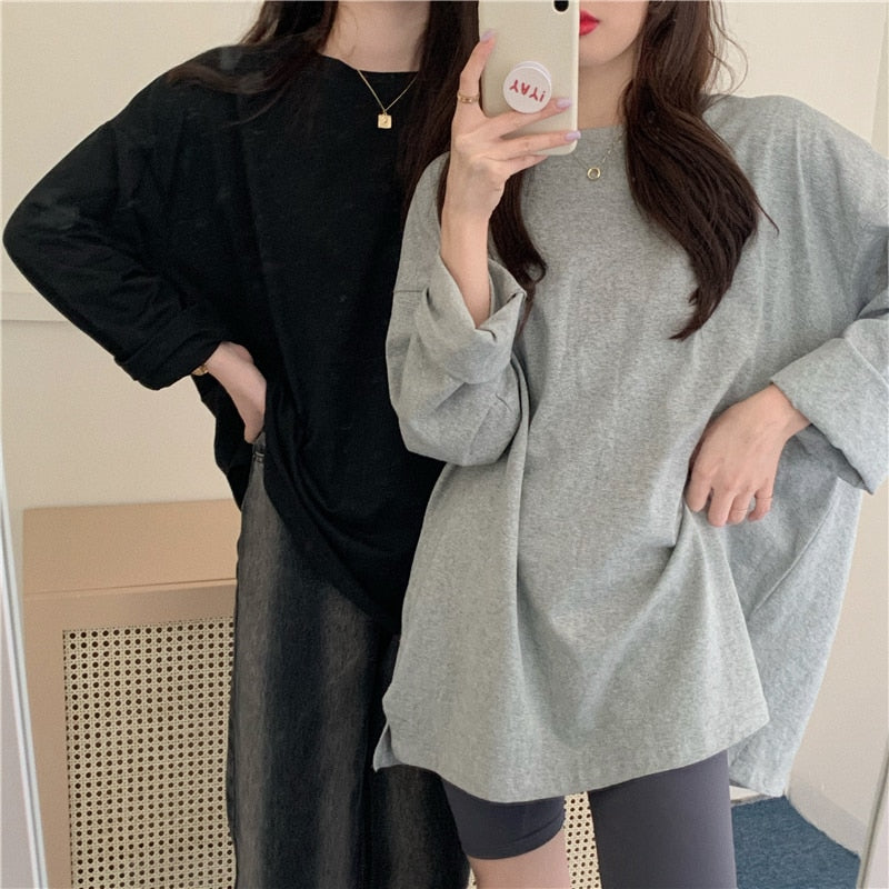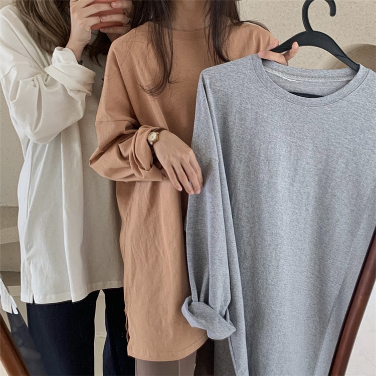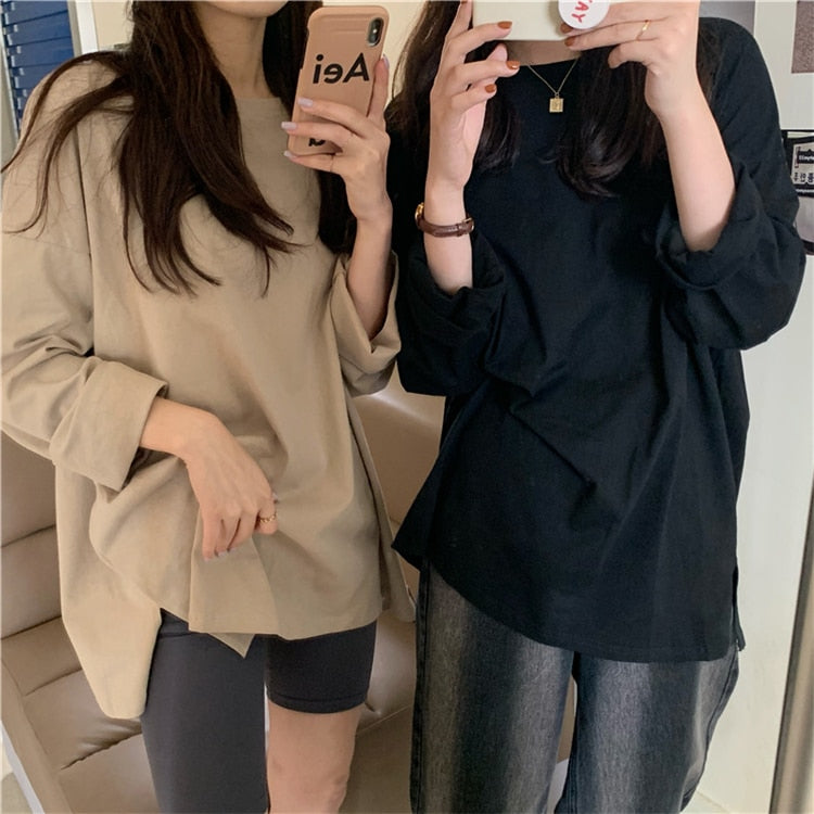 Goditi il tessuto di cotone di questa T-shirt coreana a manica lunga per guardare i boccioli della primavera sbocciare. Questo top ti offre un look piuttosto rilassato.