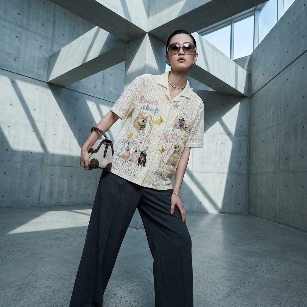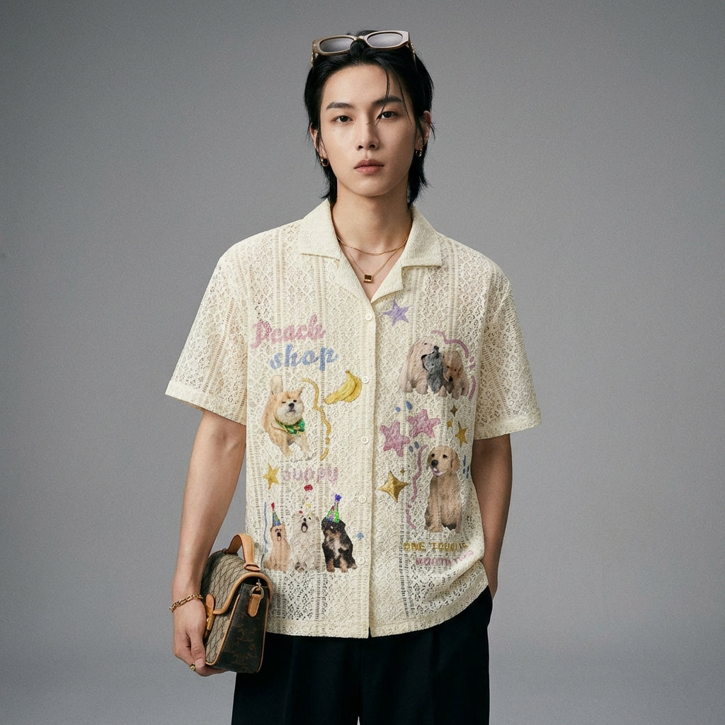 Adotta un look casual e adorabile con la nostra camicia oversize a maniche corte, decorata con un affascinante motivo a cucciolo. Il suo colletto a punta e il taglio ampio la rendono un capo ideale per uno stile unico e confortevole! 🐶