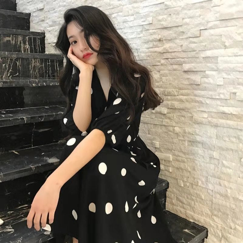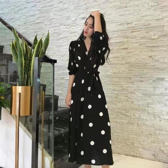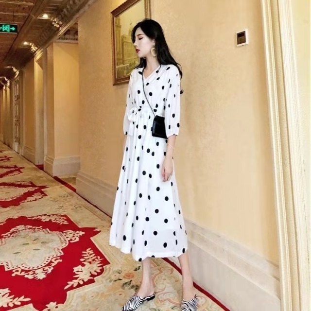 Ecco un magnifico abito a pois. È disponibile in bianco e nero. Questo abito è realizzato in un tessuto leggero e confortevole. La scollatura a V è molto alla moda in Asia e in particolare in Corea del Sud.