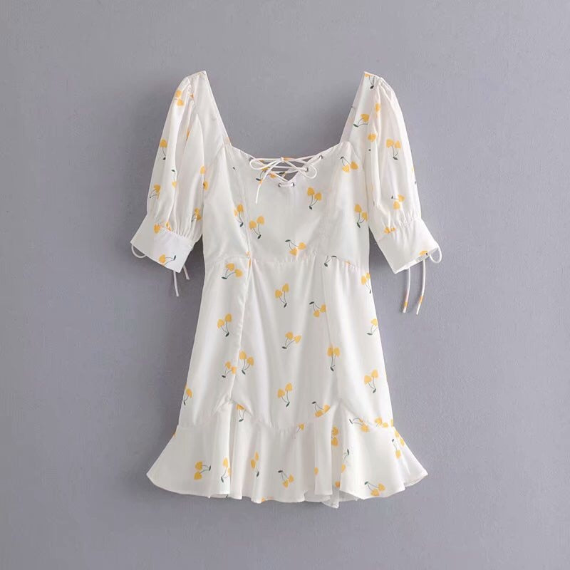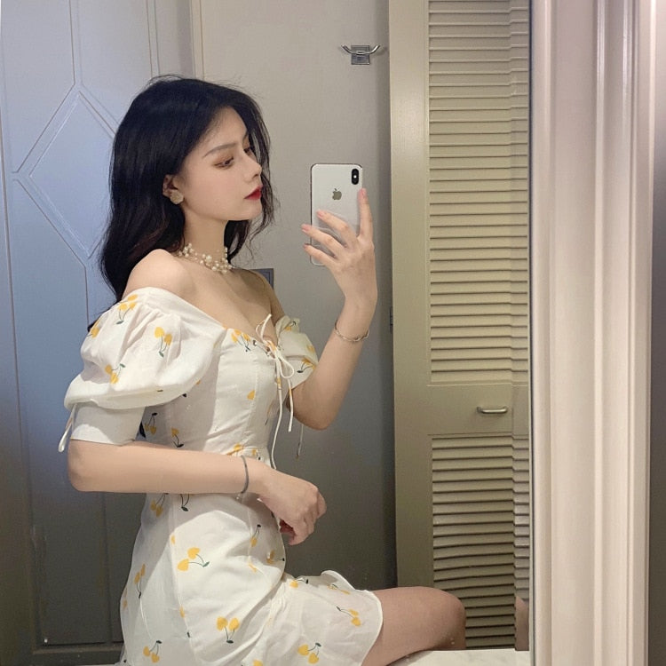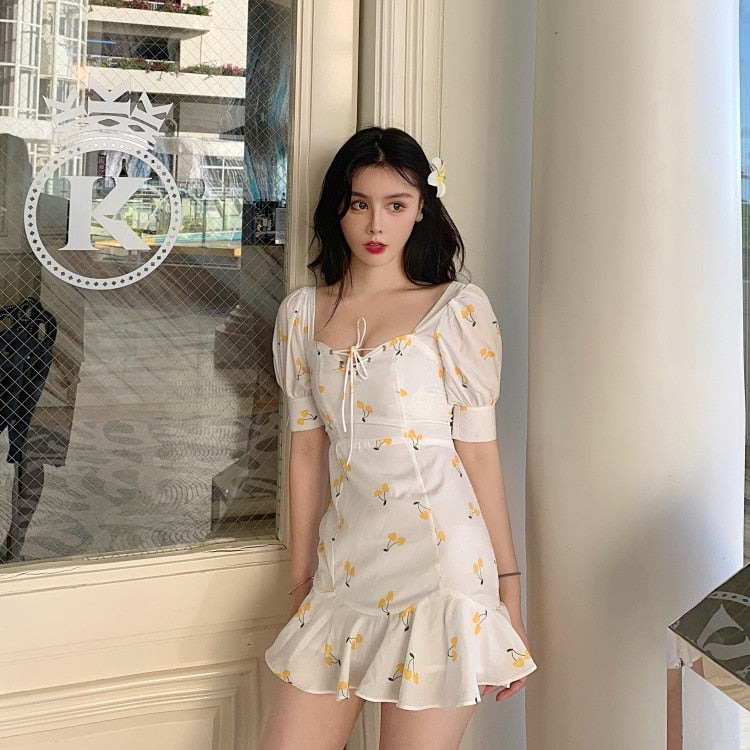 Questo abitino bianco è decorato con ciliegie gialle. Goditi lo stile leggero ed estivo di questo piccolo outfit per uscire a ballare al vento come le Blackpink.