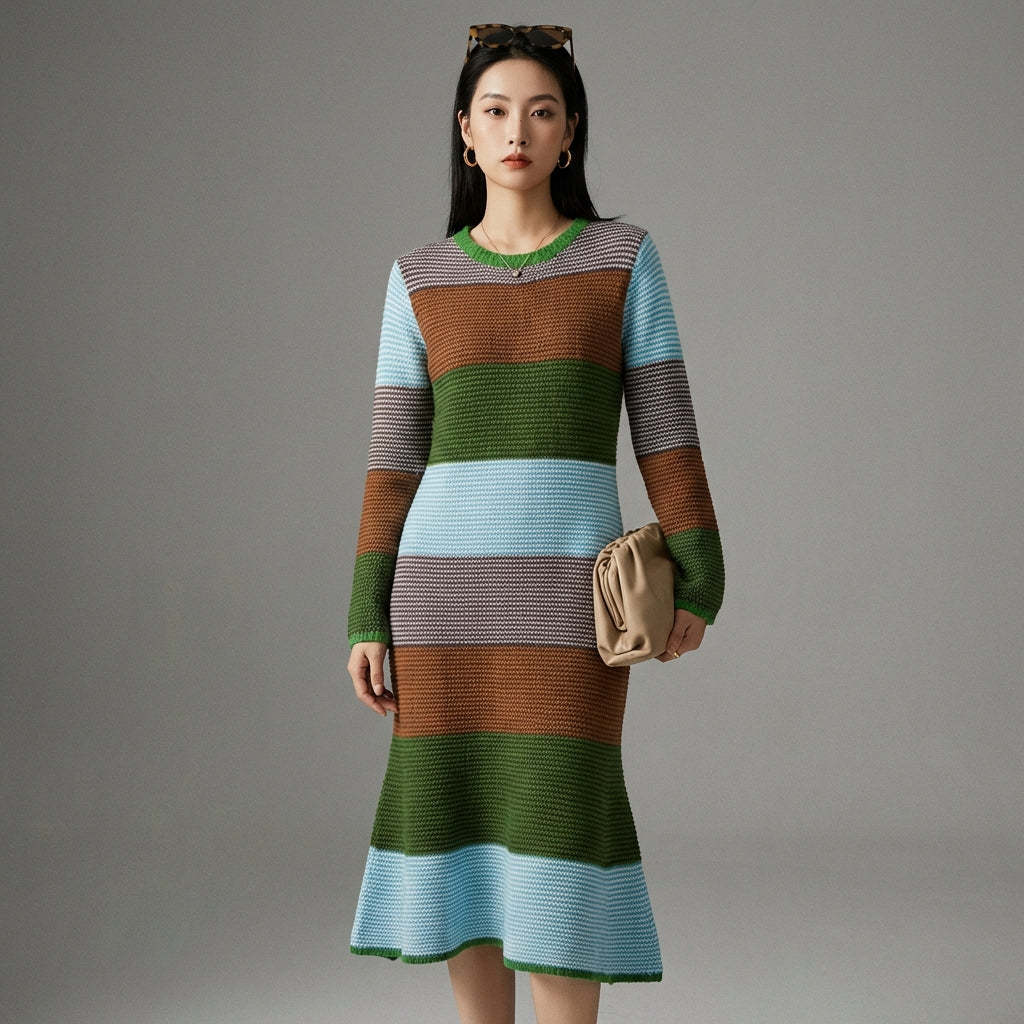 Adotta un look moderno e raffinato con il nostro abito in maglia bicolore, perfetto per ogni occasione. Il suo scollo rotondo e le maniche lunghe offrono un comfort ottimale, mentre la vita alta accentua una silhouette elegante e casual! ✨