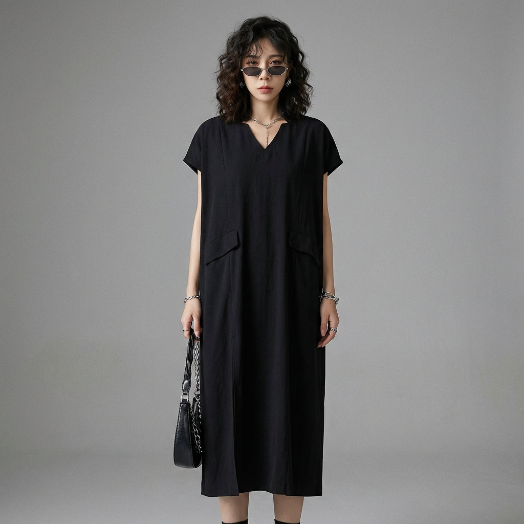 Adotta un look chic e casual con il nostro abito midi con scollo a V, maniche corte e taglio ampio. Il suo design plissettato asimmetrico e la sottile fessura aggiungono un tocco di originalità ed eleganza al tuo guardaroba. Perfetto per ogni occasione, questo abito unisce comfort e stile con brio! 💃
