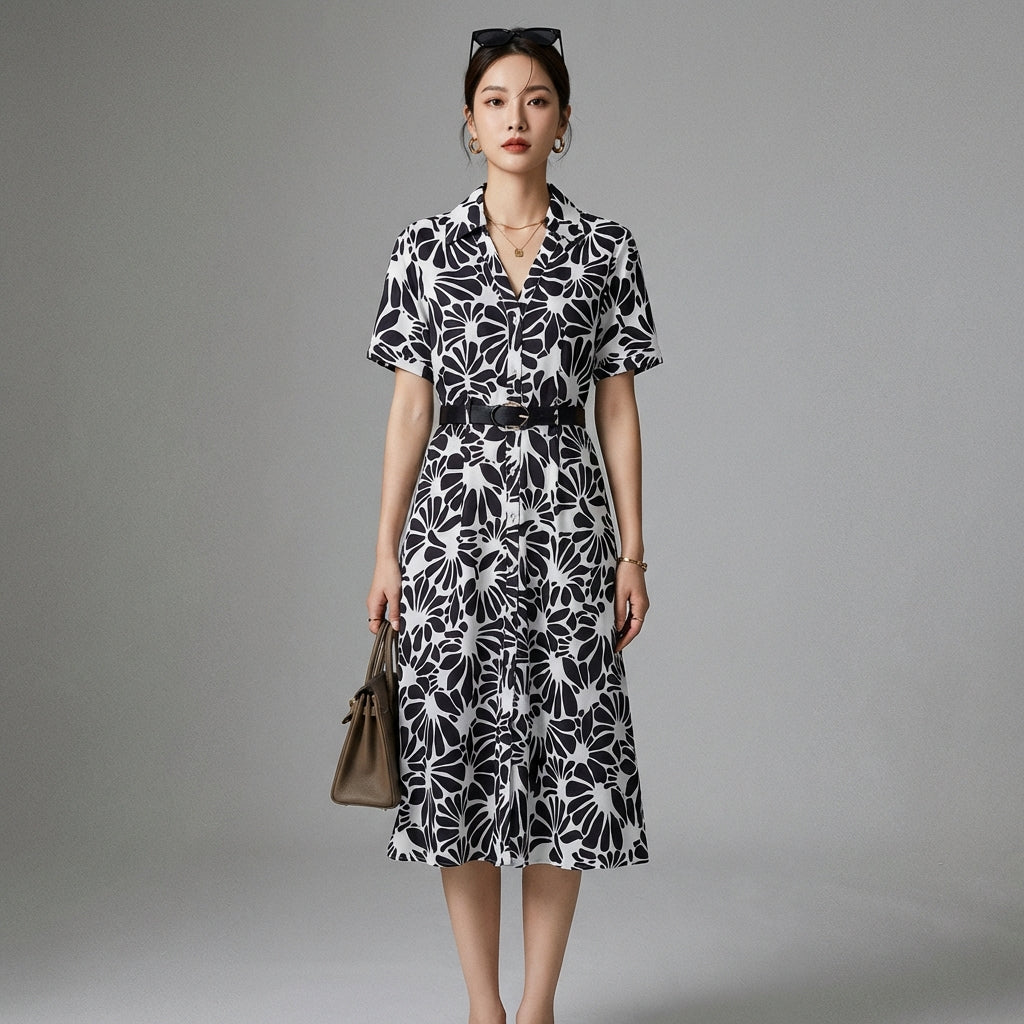Adotta un look chic e casual con il nostro vestito stampato con cintura e colletto a risvolto. Le sue maniche corte e il taglio elegante lo rendono il capo perfetto per uno stile deciso e moderno, ideale per ogni occasione! ☀️