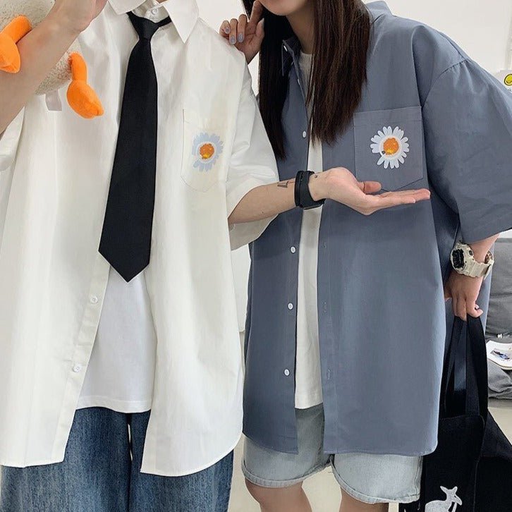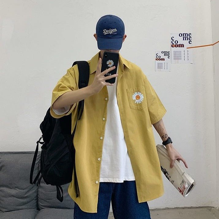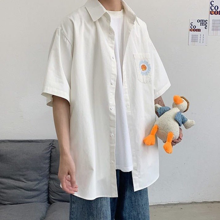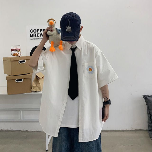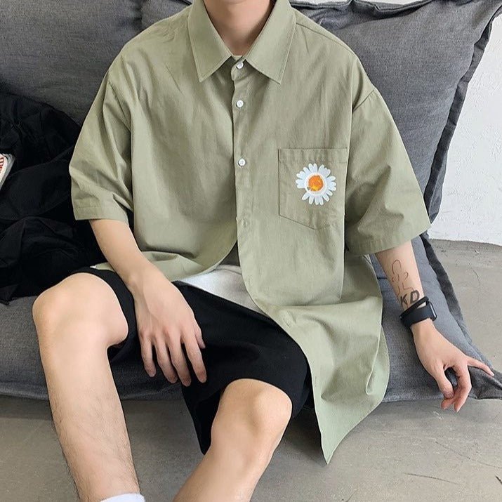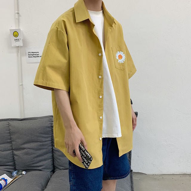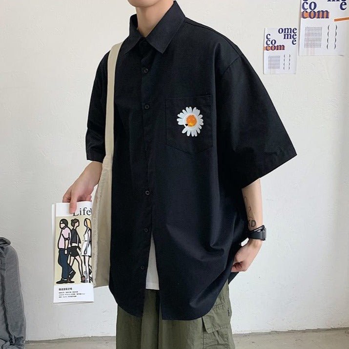 Indossa una camicia a maniche corte con una bellissima margherita sul davanti.