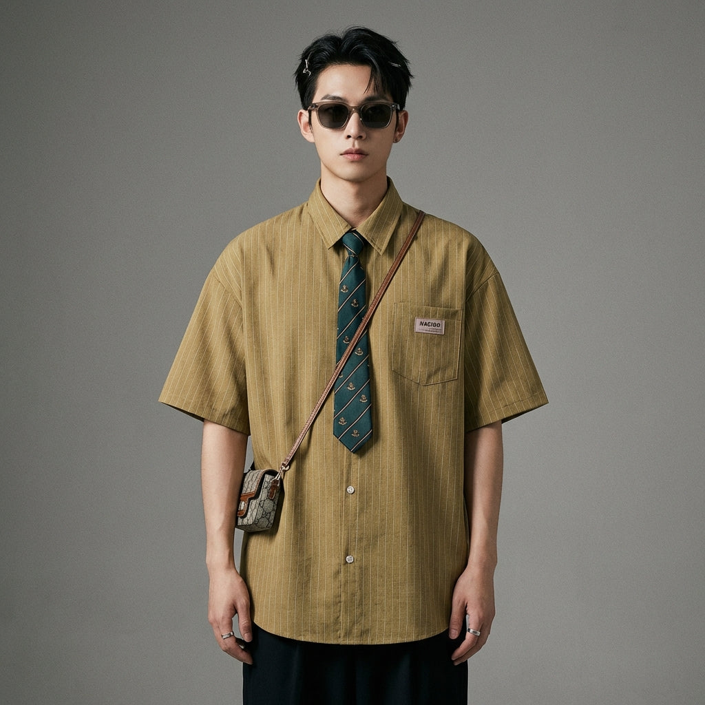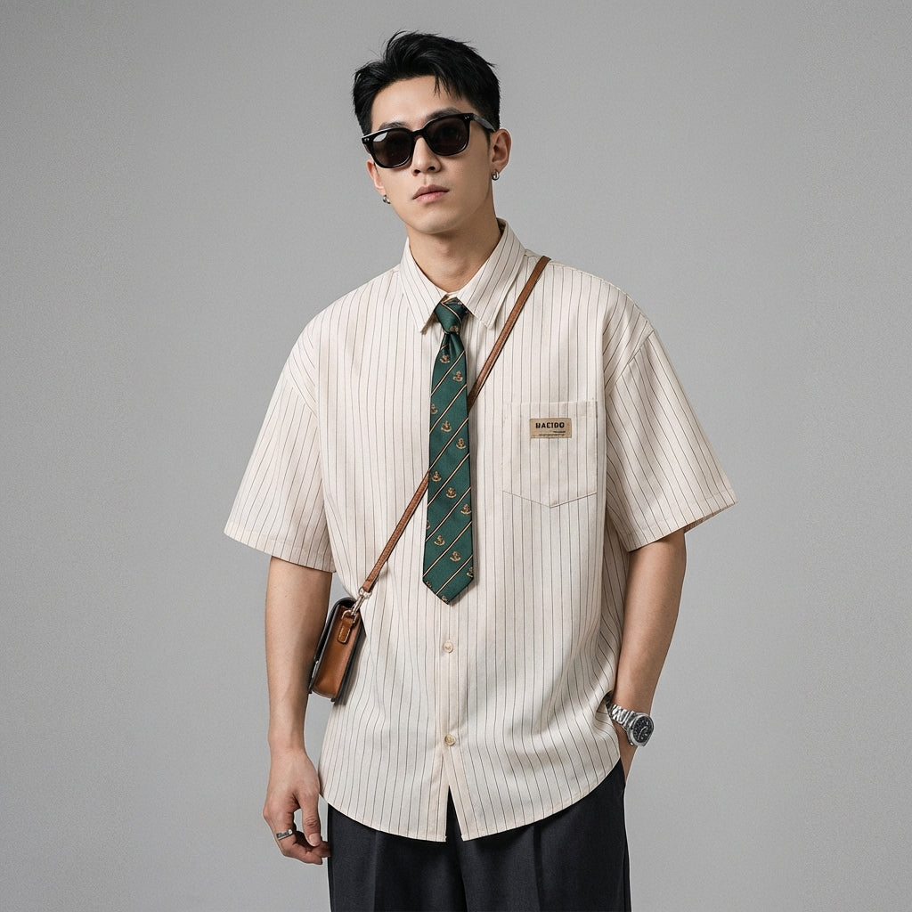 Adotta un look casual e alla moda con la nostra camicia a maniche corte, caratterizzata da un distintivo colletto a cravatta e da eleganti righe. Perfetta per uno stile universitario o una gita estiva! ☀️