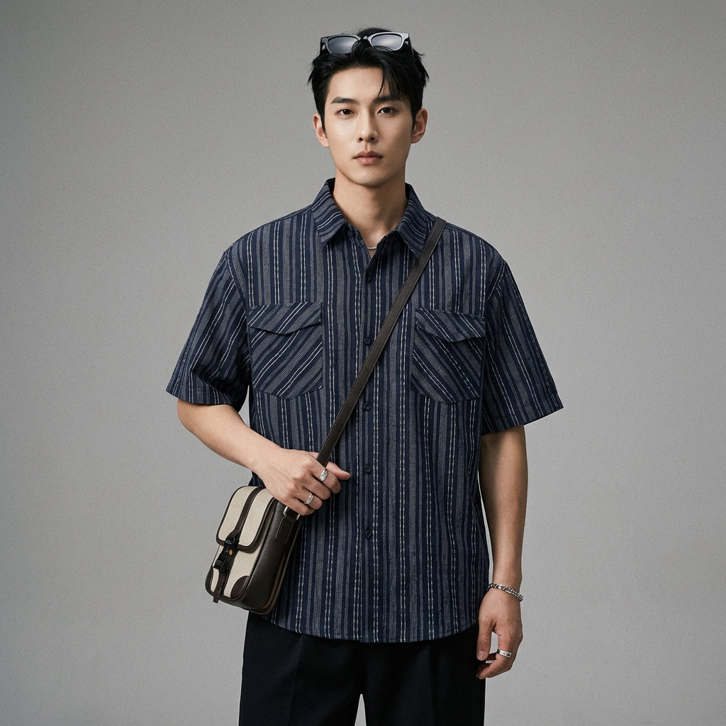 Adotta un look casual e alla moda con la nostra camicia a righe a maniche corte. Il suo design ampio e le doppie tasche applicate aggiungono un tocco di stile urbano e funzionale, perfetto per le tue giornate estive! 👕