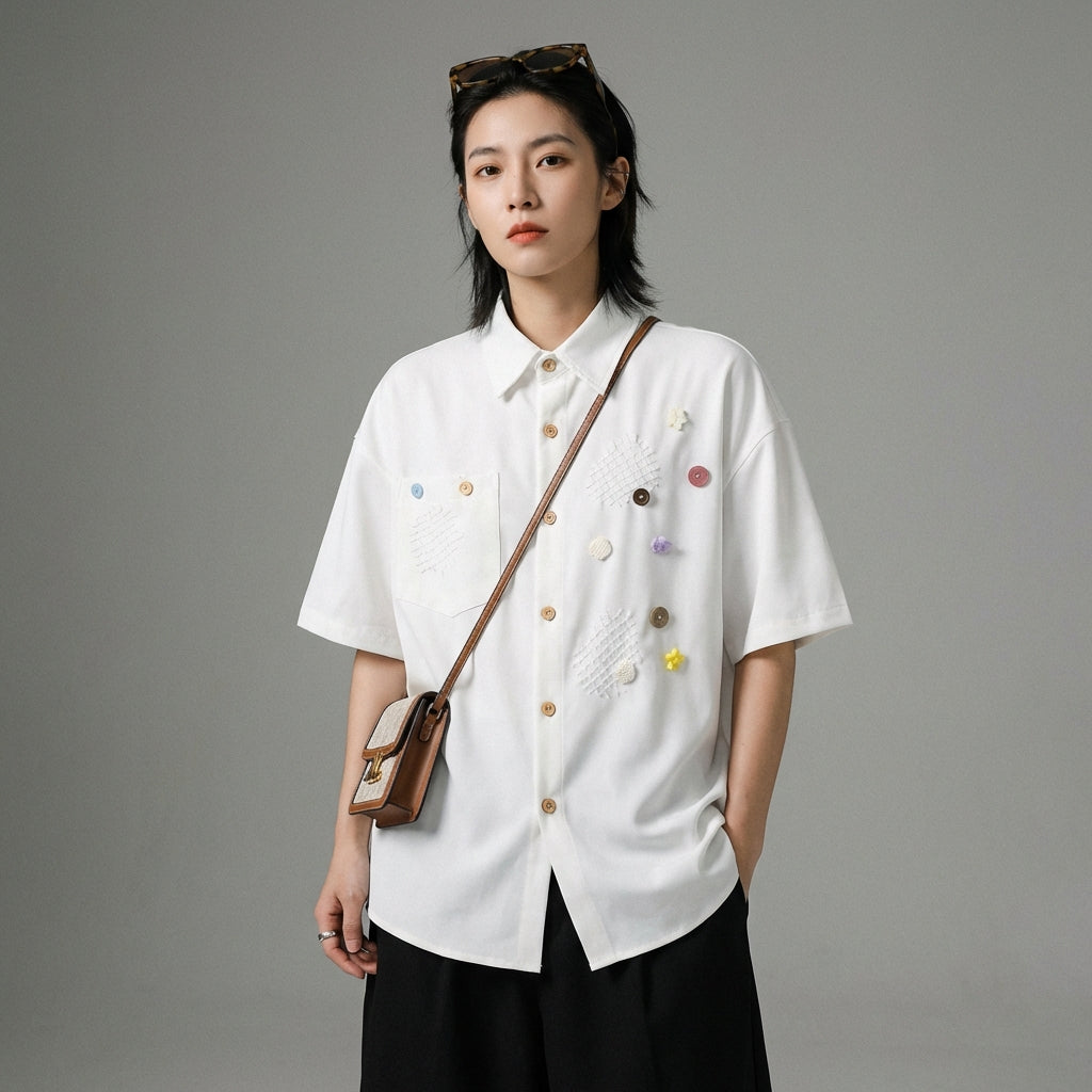 - Stile: Streetwear, K-fashion, Casual. Questa camicia incarna lo spirito libero e moderno della moda coreana, perfetta per un look urbano e rilassato.