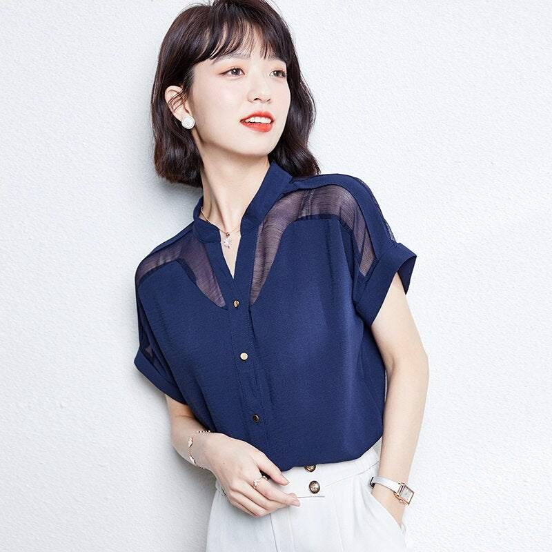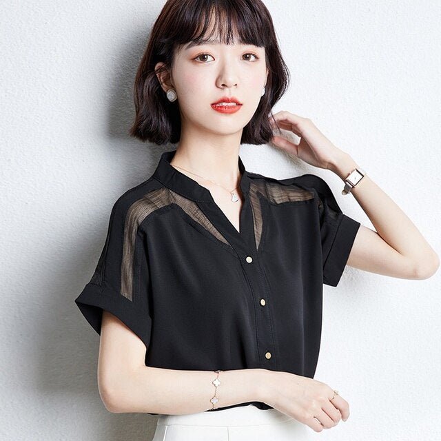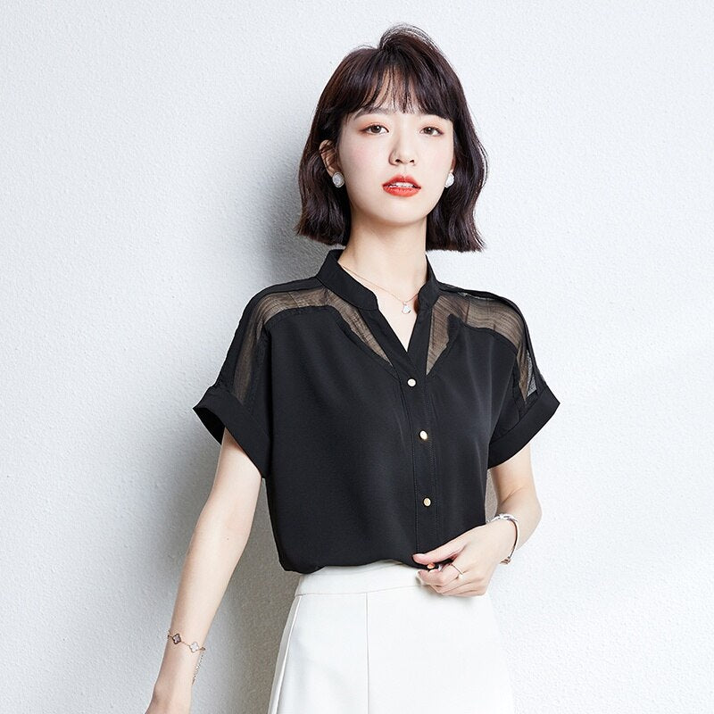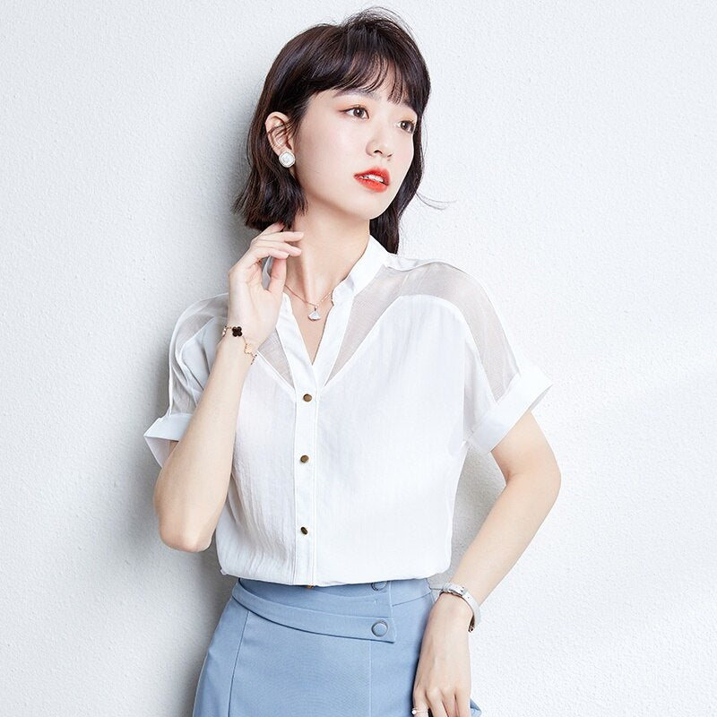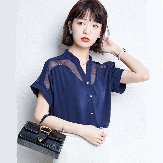 Ecco una camicia coreana con diverse opacità. È un bellissimo top coreano con un effetto stropicciato. Può essere indossata senza essere stirata, dandoti comunque un look molto alla moda. Le spalle sono più trasparenti.
