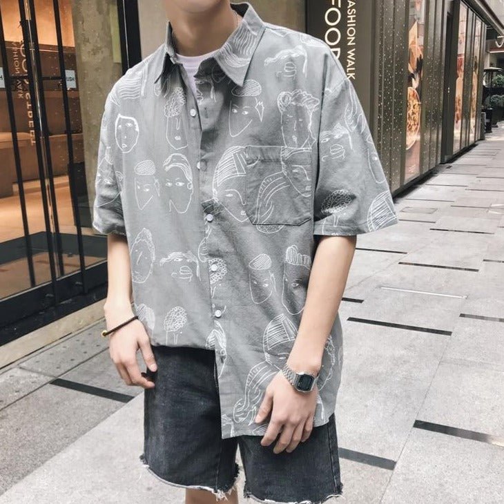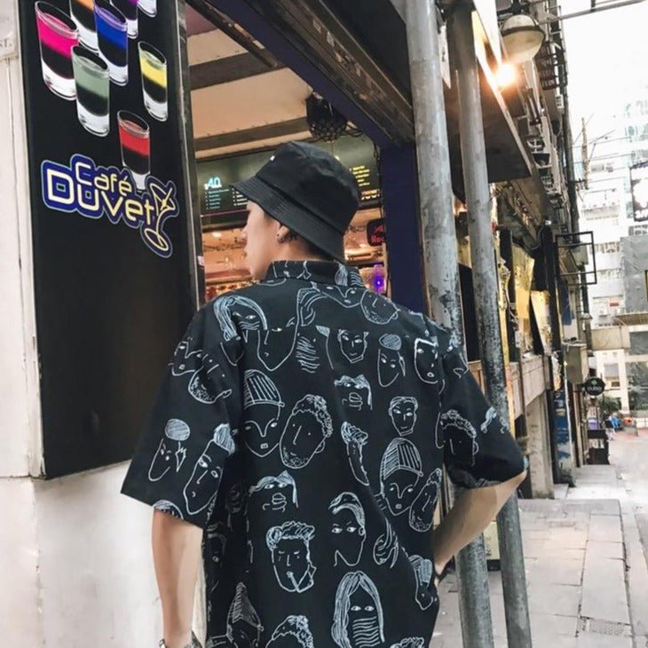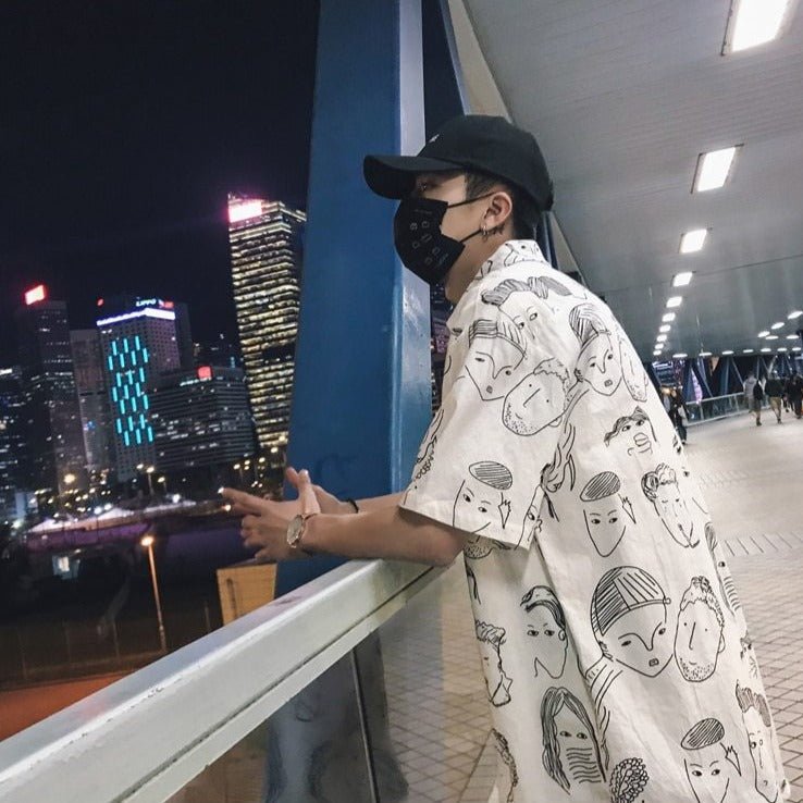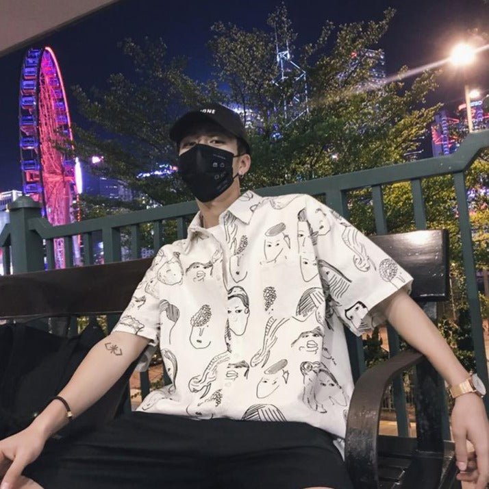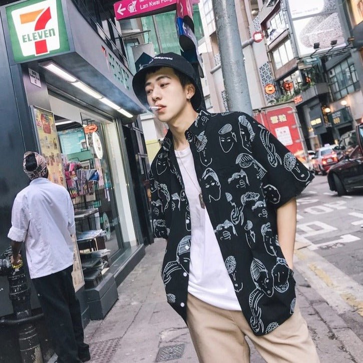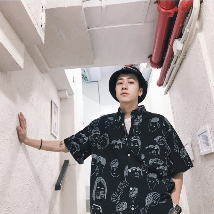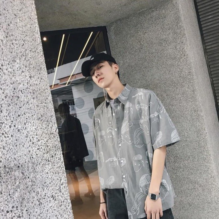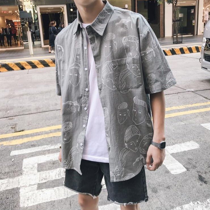 Questa camicia coreana ha un motivo particolare con volti. È una camicia dallo stile artistico. È perfetta per gli amanti dell'universo coreano. Questo modello è molto apprezzato a Gangnam.