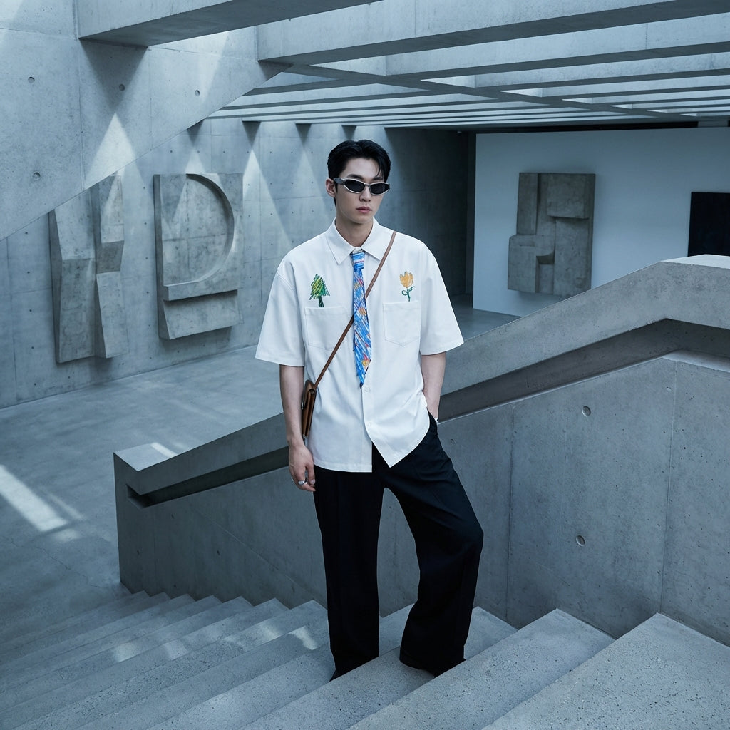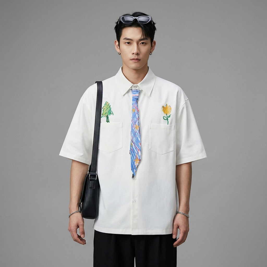 - Stile: Streetwear, K-fashion, Urbano. Questa camicia incarna lo spirito della moda coreana con un tocco artistico e casual, perfetta per un look moderno.