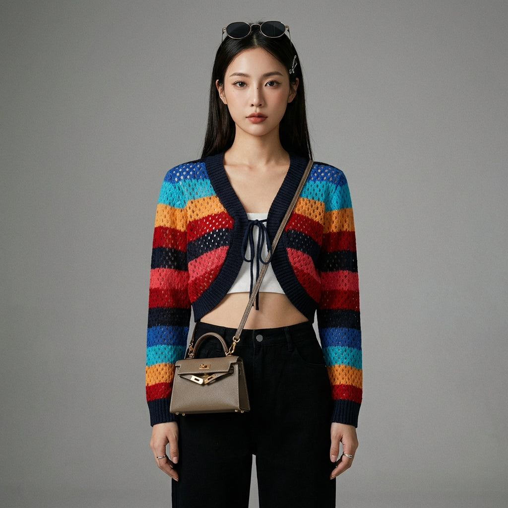 Adotta un look trendy e leggero con il nostro cardigan corto traforato, perfetto per completare i tuoi outfit. Le sue righe a contrasto e il design annodato aggiungono un tocco di originalità al tuo stile! ✨