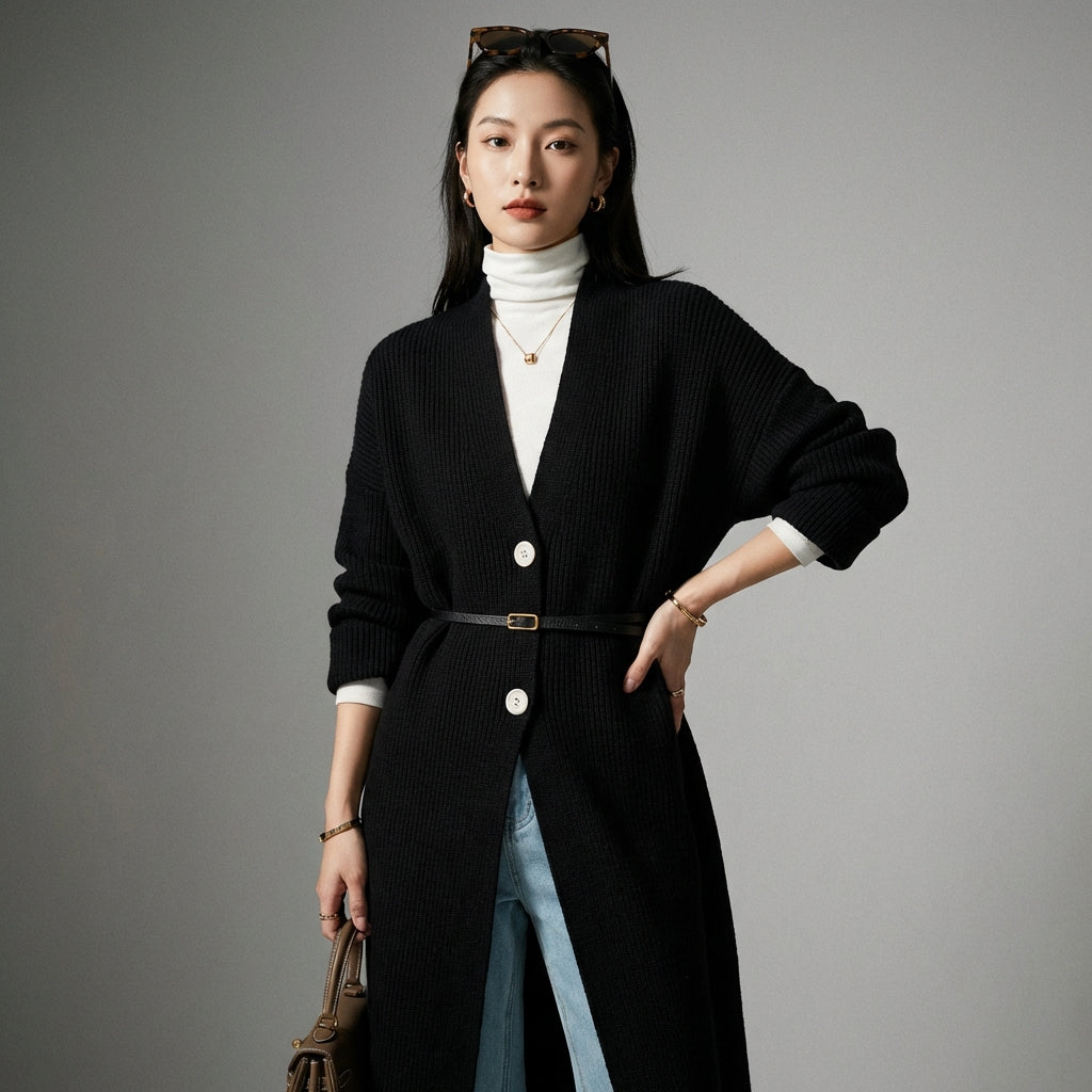 - Stile: Elegante, Minimalista, K-fashion. Questo cardigan incarna l'eleganza discreta e le linee pulite della moda coreana, perfetto per un look chic e di tendenza.