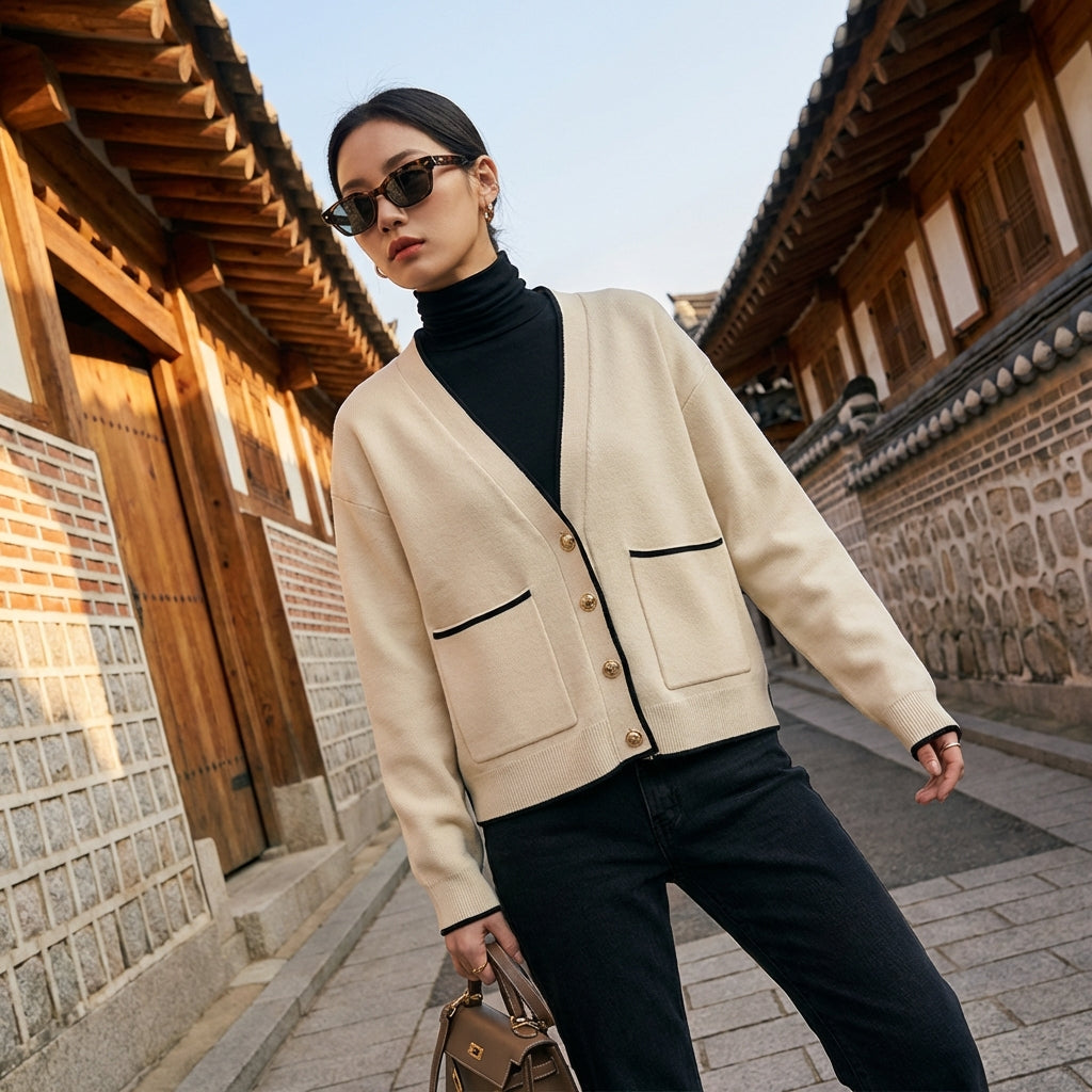 - Stile: Moda coreana, Casual, Minimalista. Questo cardigan incarna l'eleganza semplice e la disinvoltura, molto apprezzate nella K-fashion.