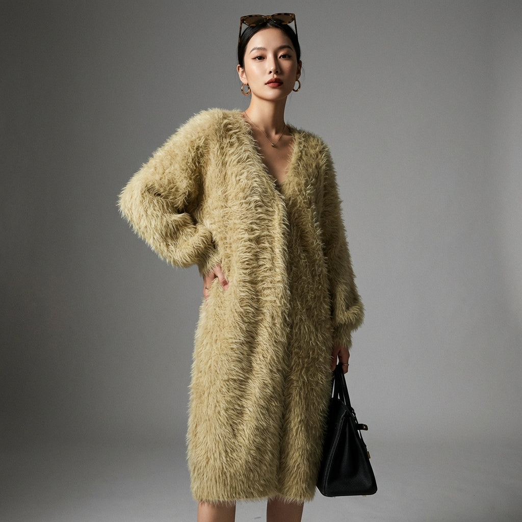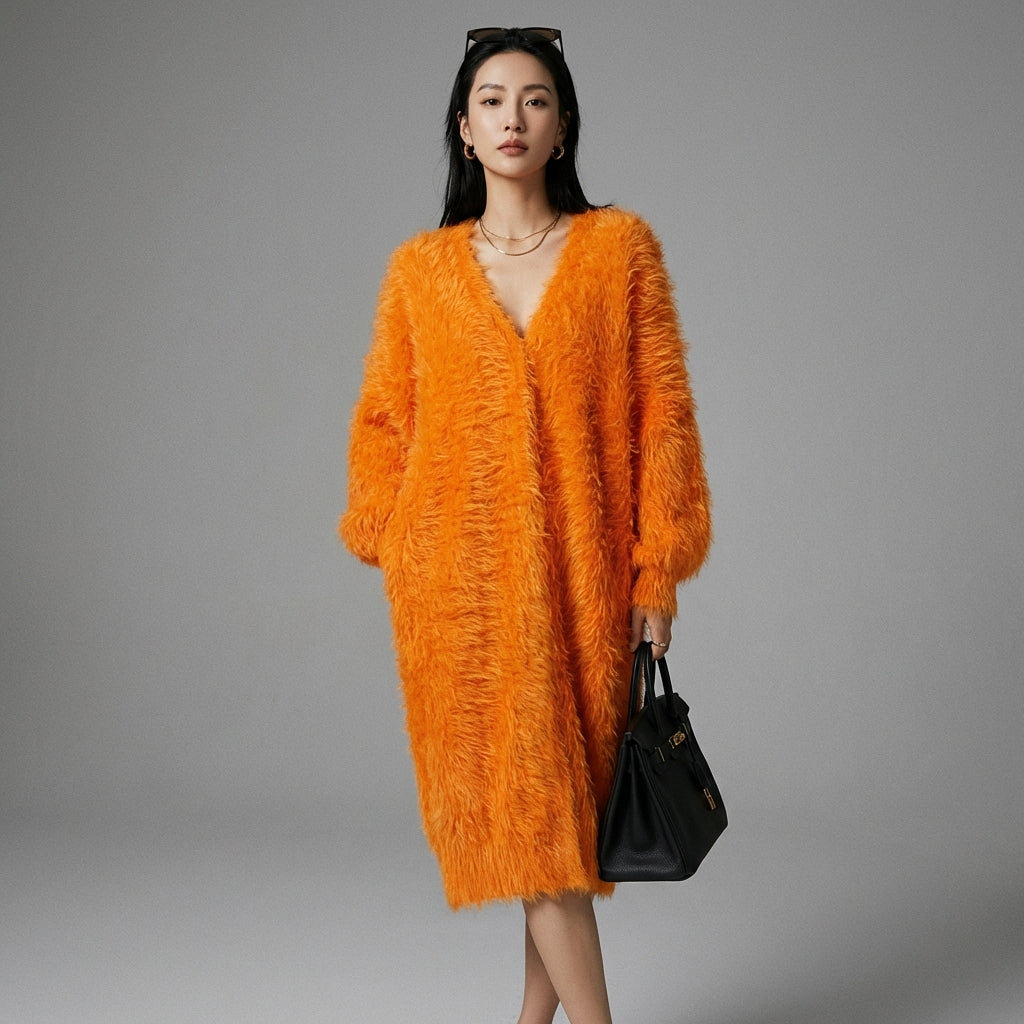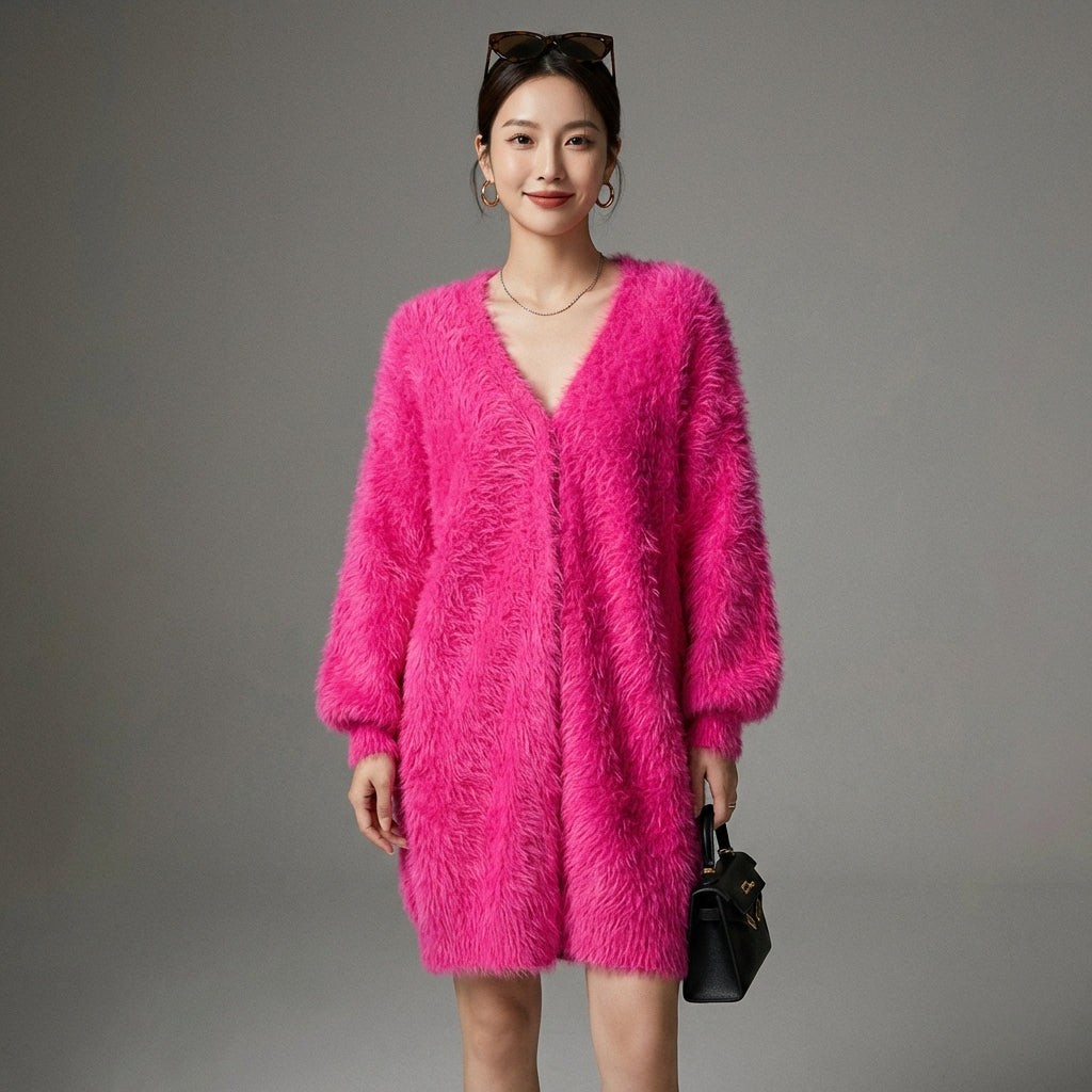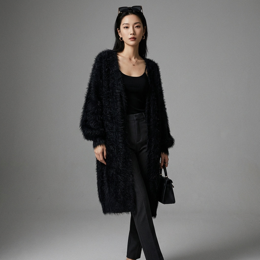 - Tipo: Cardigan lungo, Vestibilità ampia. La sua lunghezza e il taglio generoso assicurano comfort e stile, perfetto per tutte le silhouette.