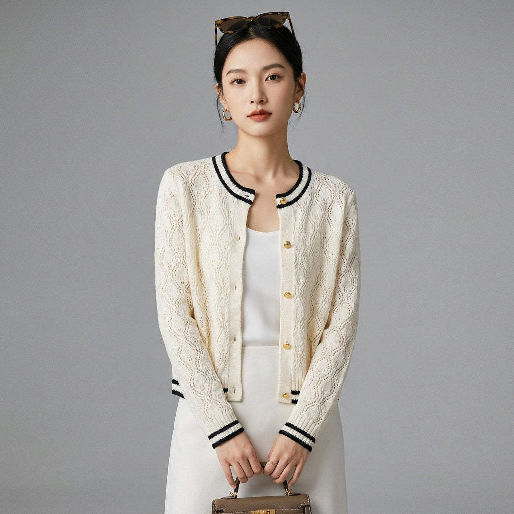 Adotta un look chic e casual con il nostro cardigan in maglia traforata. Il suo collo rotondo e il taglio aderente esaltano la silhouette, mentre le maniche lunghe e i bottoni aggiungono un tocco di eleganza. Perfetto per le giornate più fresche! ✨
