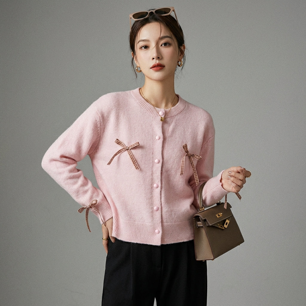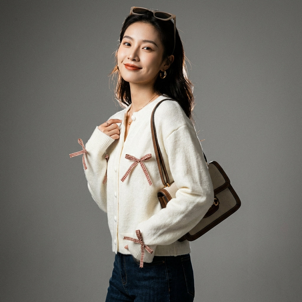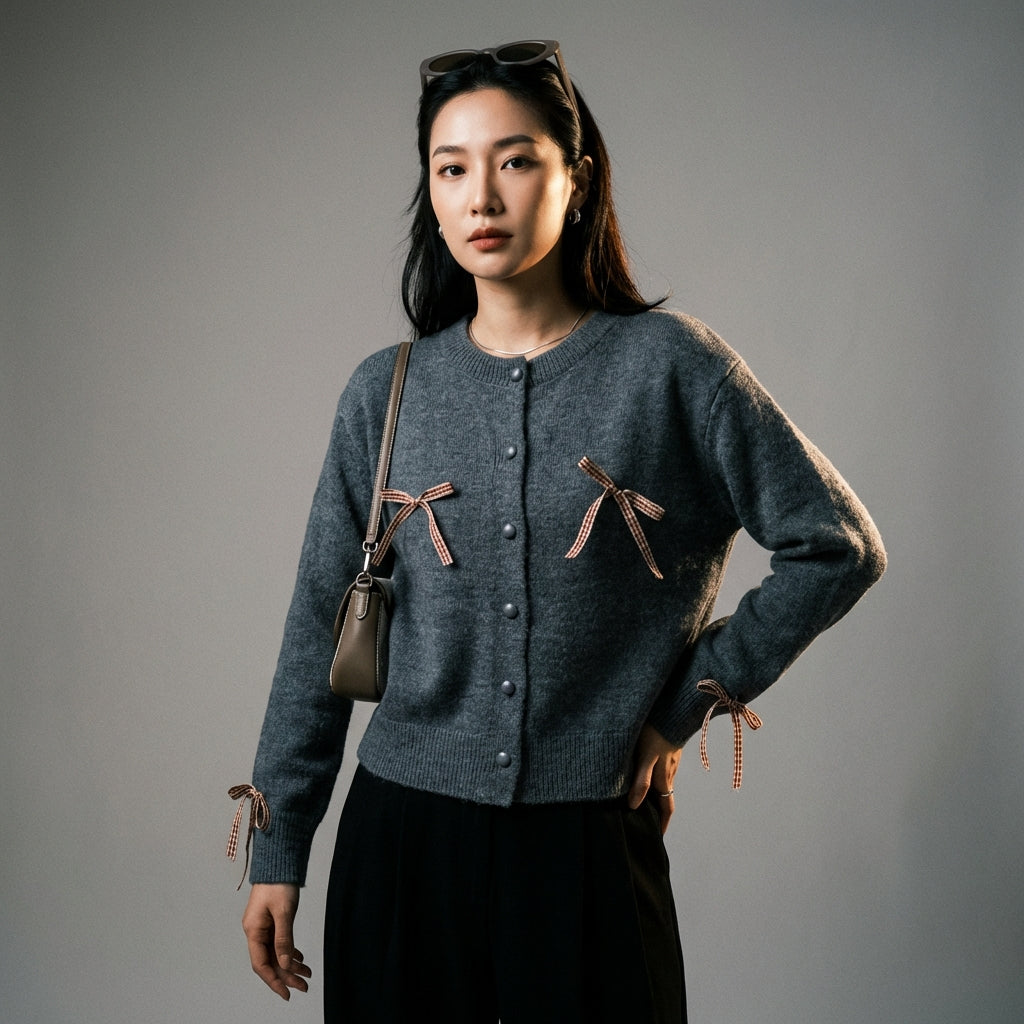 Adotta un look dolce e raffinato con il nostro cardigan in maglia, impreziosito da affascinanti dettagli a fiocco. Questo maglione elegante e confortevole è perfetto per aggiungere un tocco di raffinatezza a tutti i tuoi outfit! 🎀