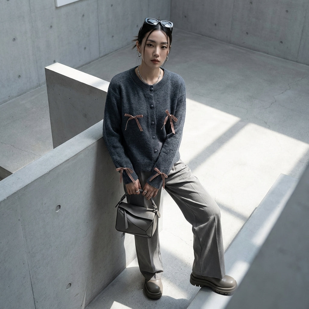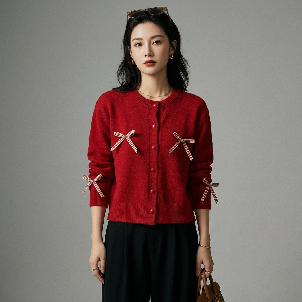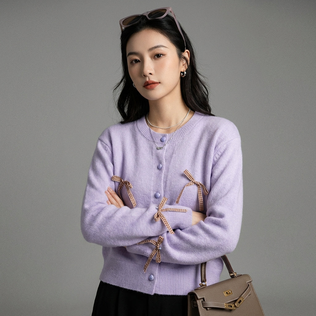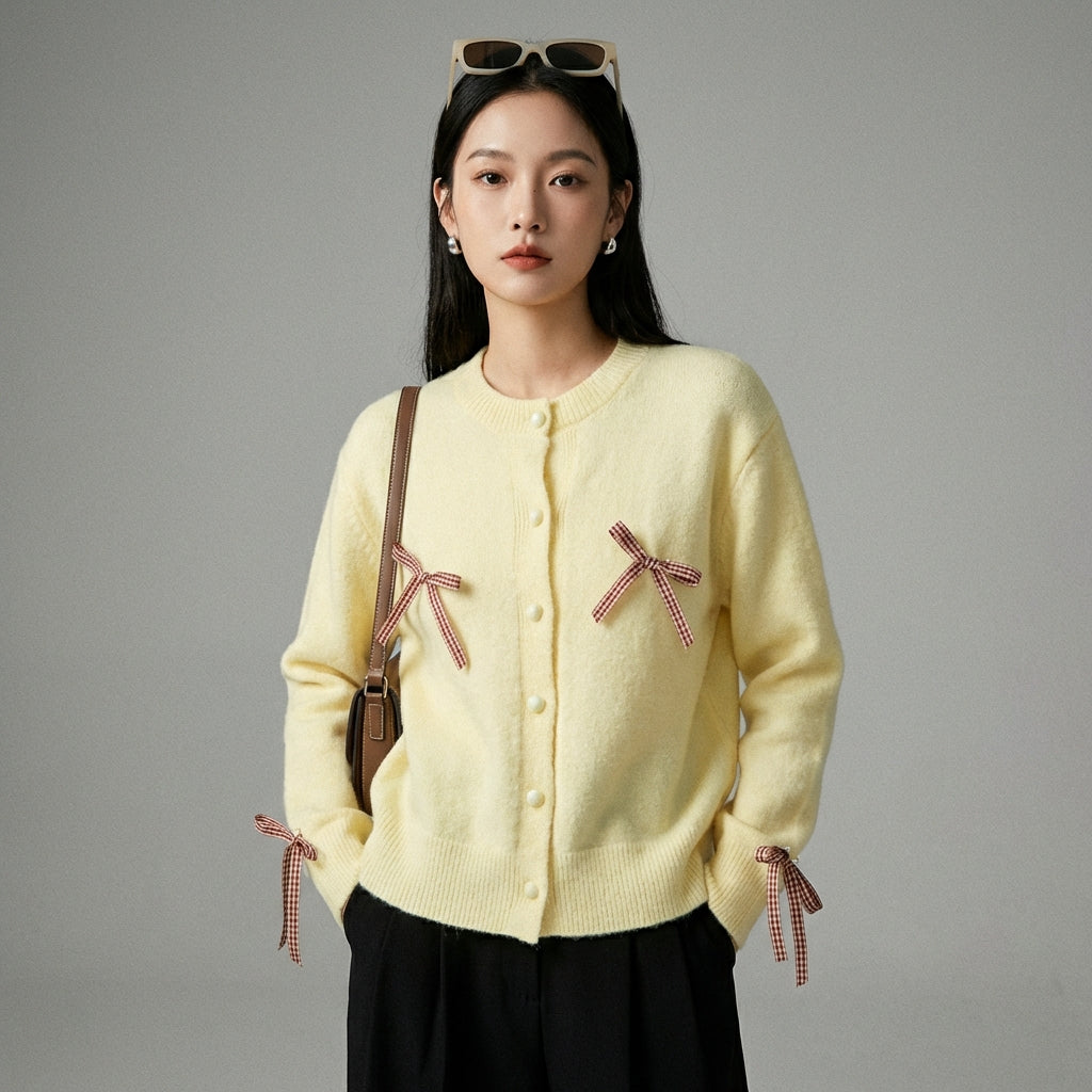 Adotta un look dolce e raffinato con il nostro cardigan in maglia, impreziosito da affascinanti dettagli a fiocco. Questo maglione elegante e confortevole è perfetto per aggiungere un tocco di raffinatezza a tutti i tuoi outfit! 🎀