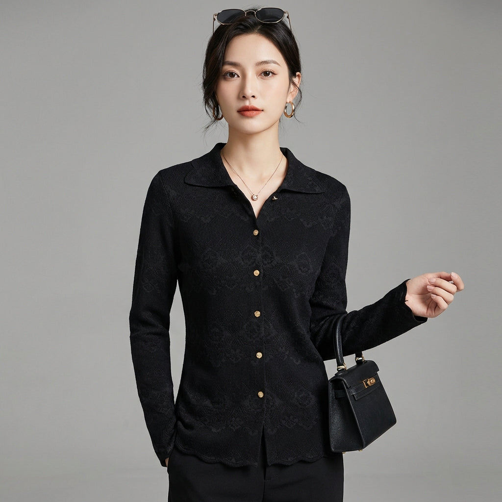 Adotta l'eleganza discreta con il nostro cardigan in maglia, caratterizzato da un sofisticato colletto a camicia e finiture in pizzo. Il suo taglio aderente esalta la silhouette, ideale per un look chic e professionale ogni giorno! 🌸