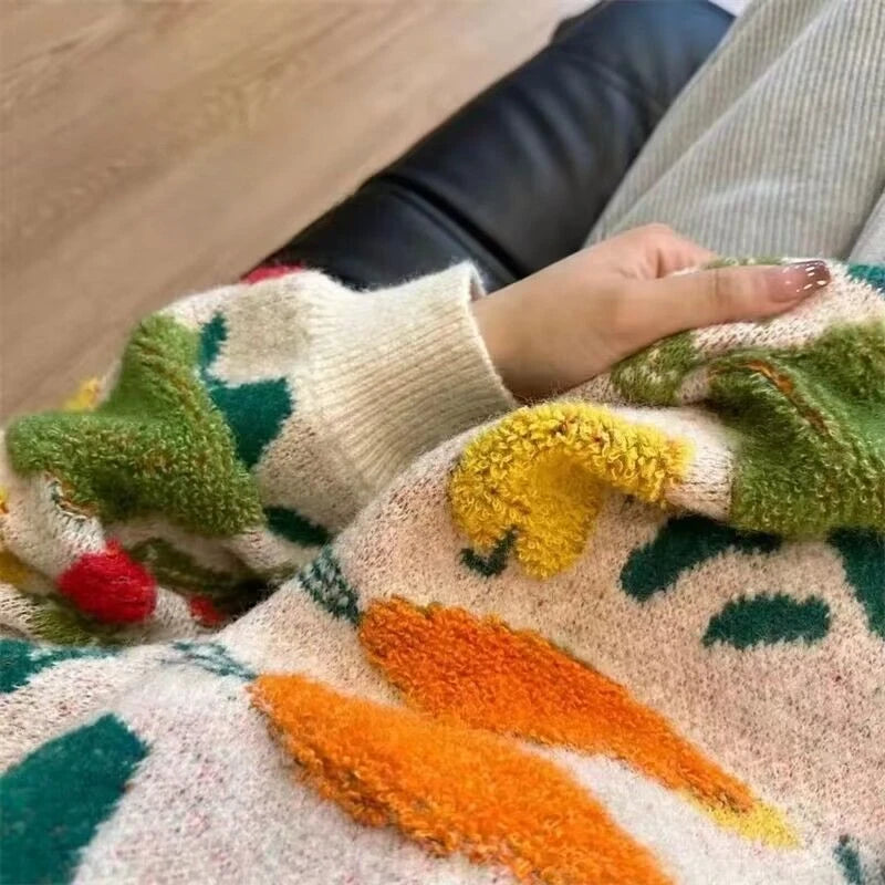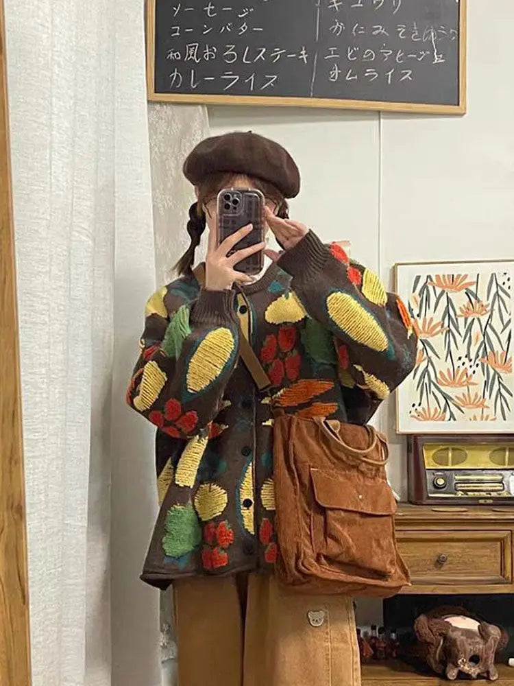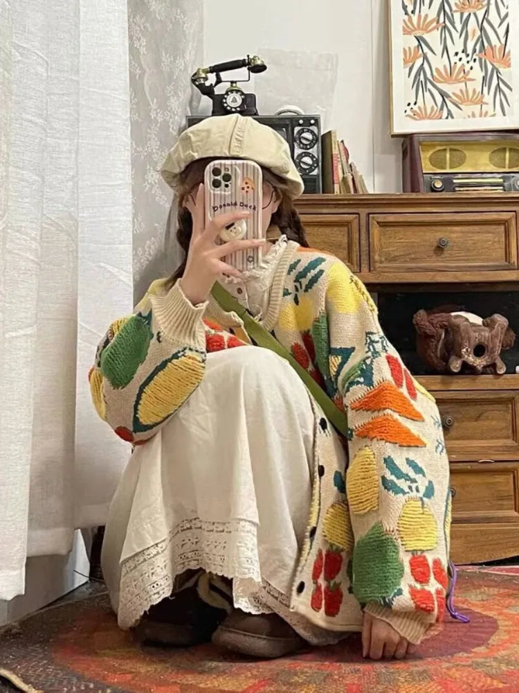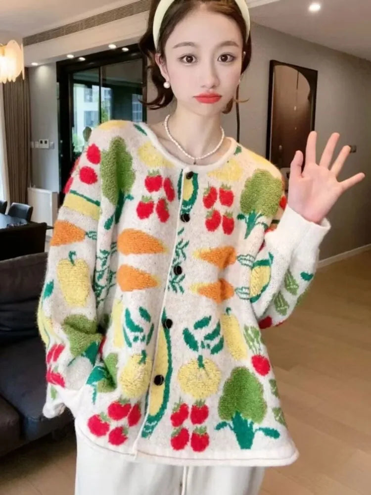 Adotta uno stile casual e alla moda con il nostro cardigan oversize in jacquard con motivo frutta. Questo capo versatile e confortevole è perfetto per tutte le tue uscite! 🍑