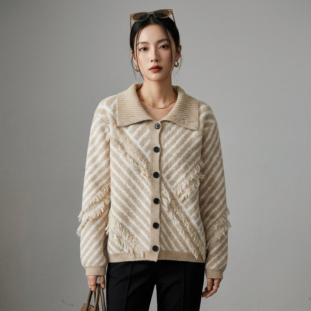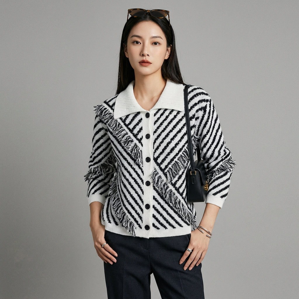 Adotta un look casual e chic con il nostro cardigan in maglia con colletto polo, ornato da strisce a contrasto e un design ampio. Questo maglione, chiuso da un unico bottone, è perfetto per aggiungere un tocco di stile K-fashion al tuo guardaroba. Ideale per comfort ed eleganza quotidiana! ✨