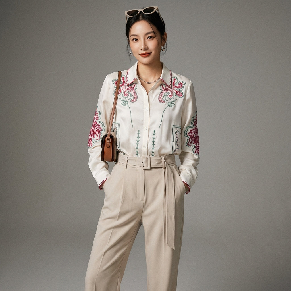 Scopri il nostro elegante completo camicia e pantaloni in raso, perfetto per un look casual ma sofisticato. La camicia a maniche lunghe presenta un motivo raffinato, mentre i pantaloni abbinati a vita alta offrono una silhouette fluida e confortevole. Ideale per chi cerca un outfit alla moda e facile da indossare! ✨