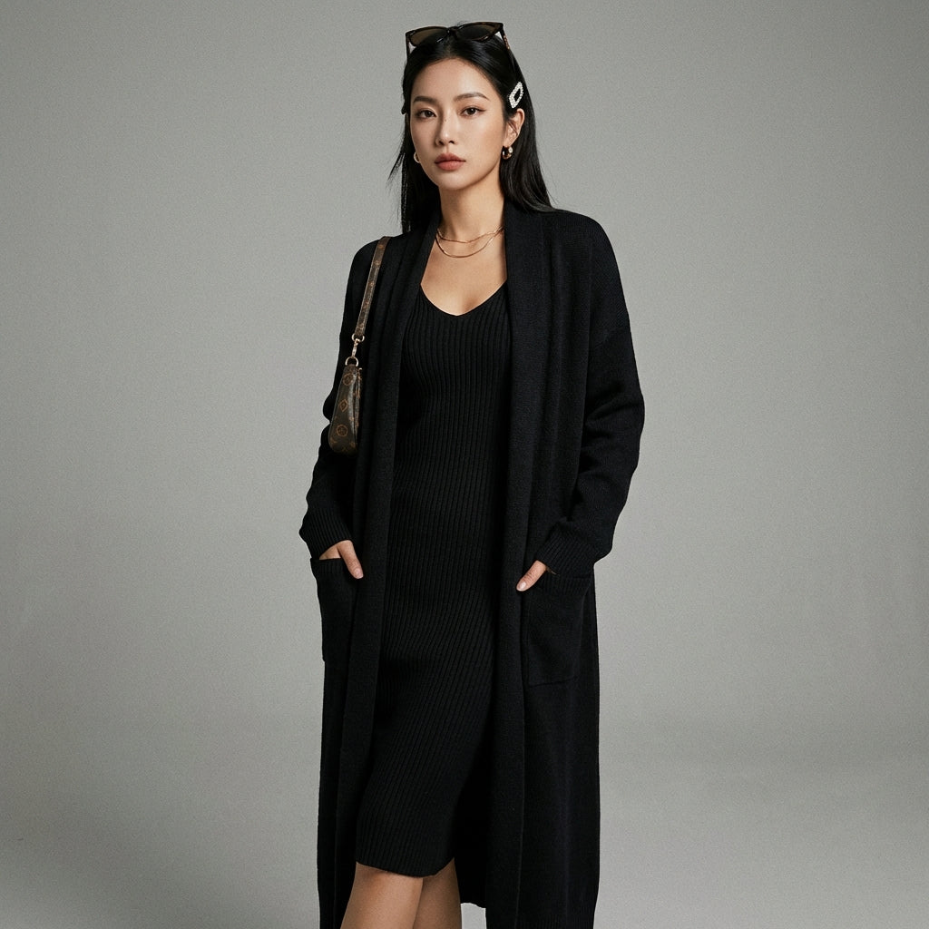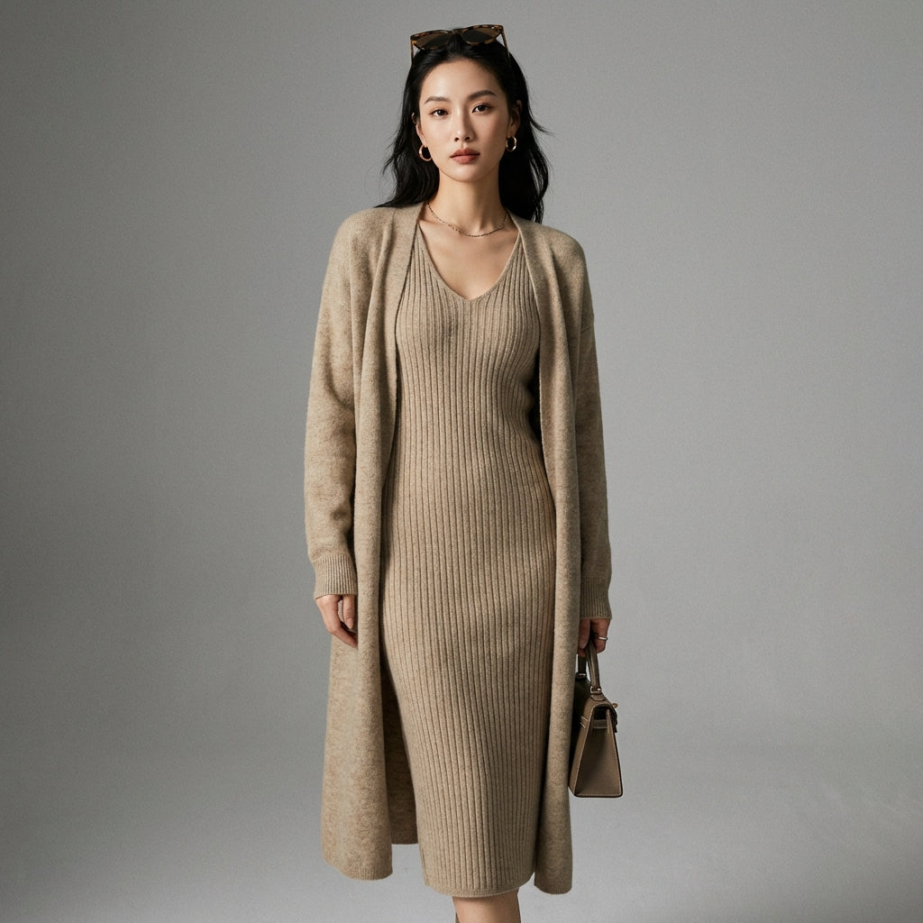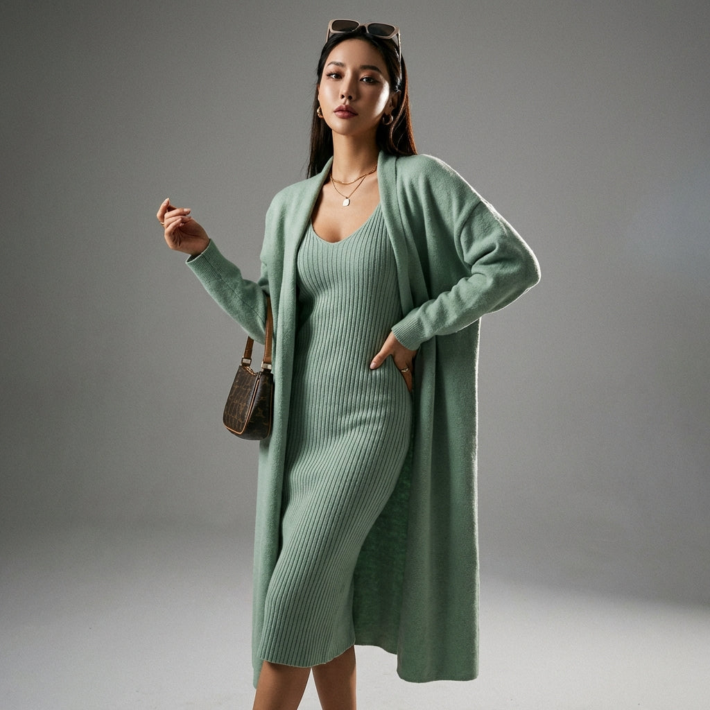 Adotta un look chic e confortevole con il nostro completo in maglia, composto da un abito elegante e un cardigan lungo. Ideale per stratificare e creare outfit versatili e sofisticati! ✨