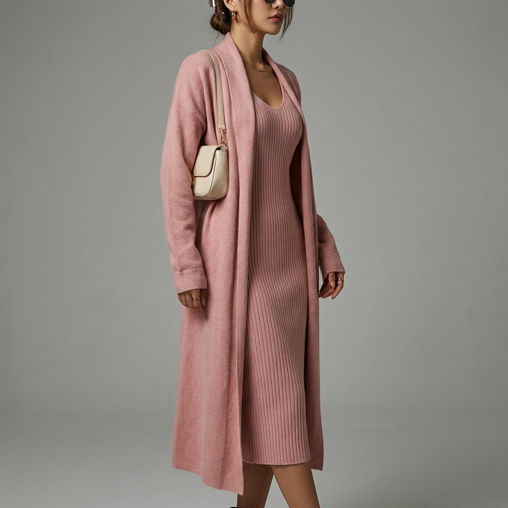 - Tipo: Completo due pezzi, Abito e Cardigan lungo. Una combinazione armoniosa che permette di variare gli stili e di adattare il tuo outfit a ogni occasione.