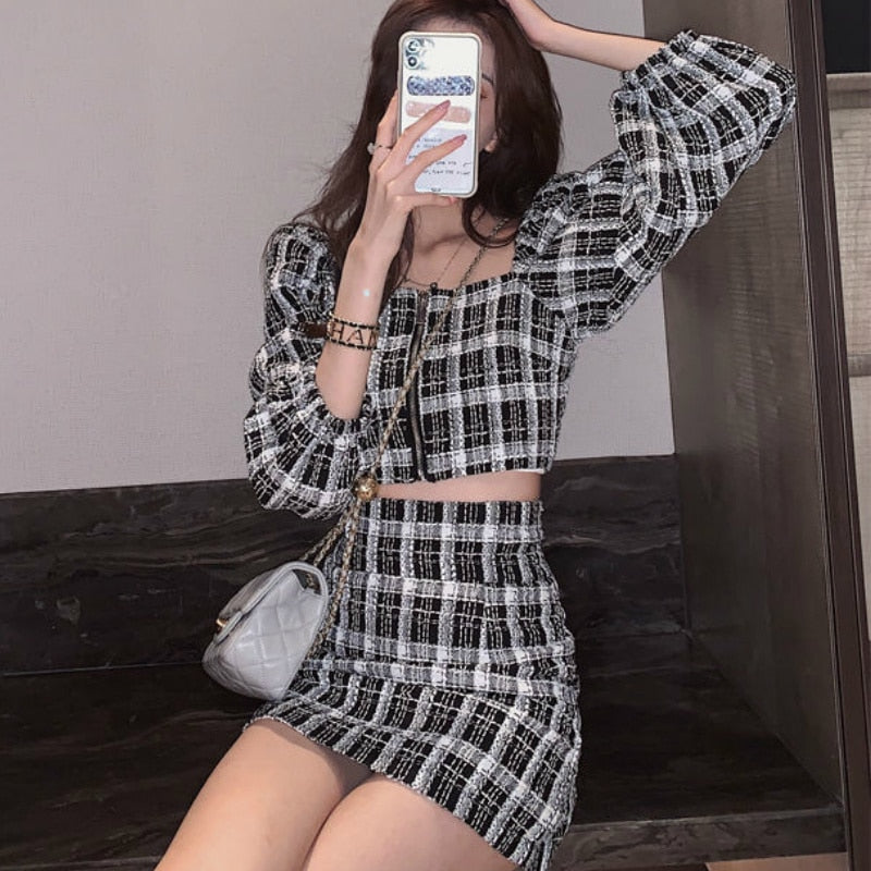 Se apprezzi gli outfit corti con motivi a quadri, questo piccolo completo ti piacerà. Si tratta di un top con spalle scoperte e una gonna corta. Questi due capi hanno un bel colore grigio e sono disegnati come quadri. Questo li rende molto morbidi e graziosi.