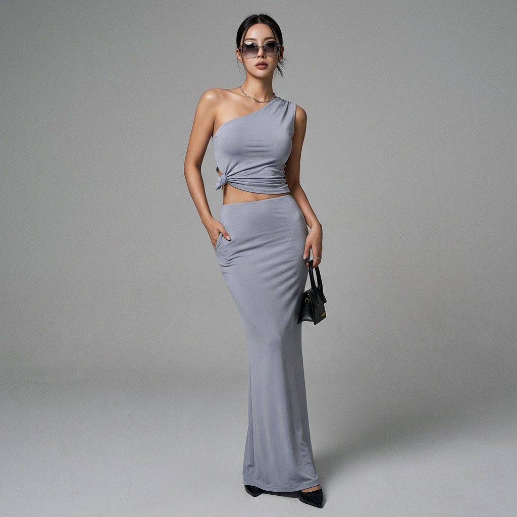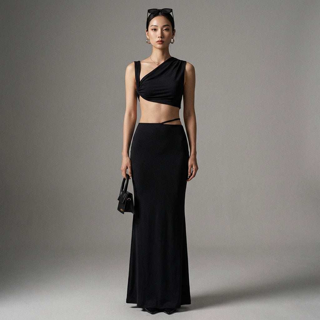Afferma la tua eleganza con il nostro completo chic composto da un crop top aderente e una gonna lunga attillata. Ideale per una silhouette raffinata e moderna in ogni occasione! ✨