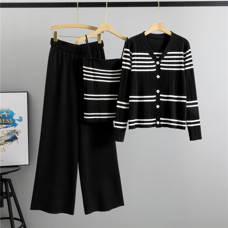 Scopri il nostro set coreano a righe in maglia da donna, composto da un cardigan con scollo a V, un top senza maniche e pantaloni a vita alta. Questo set di tre pezzi è perfetto per un look chic e moderno! 🌟