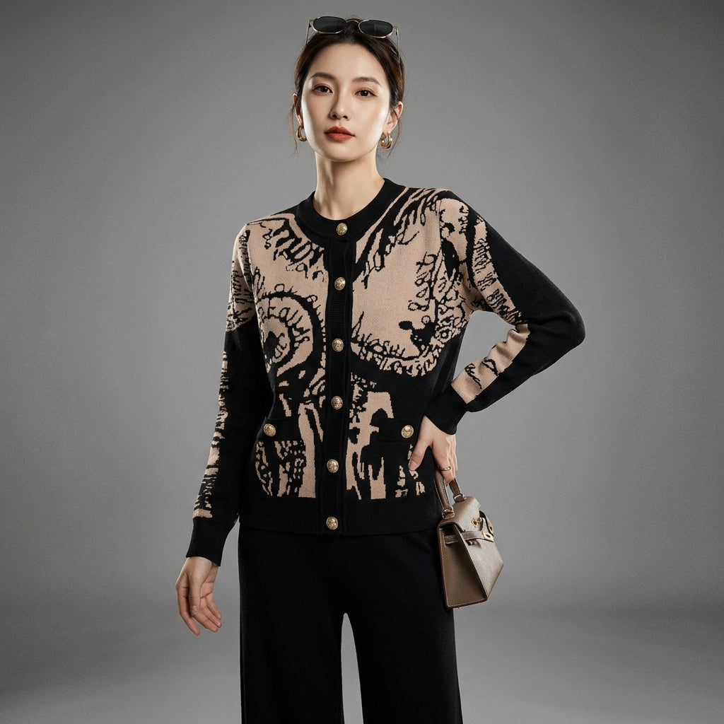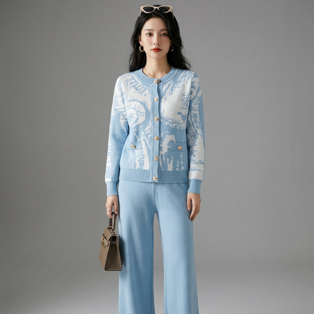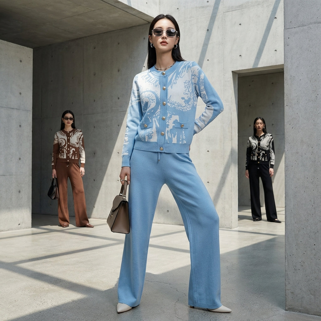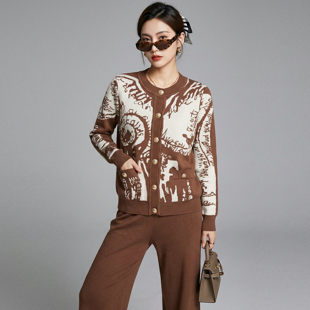 Adotta un look elegante e casual con il nostro completo due pezzi, composto da un maglione abbottonato a maniche lunghe e pantaloni larghi abbinati. Realizzato in un raffinato tessuto jacquard, questo completo offre un comfort ottimale e un'eleganza sofisticata, perfetta per ogni occasione! ✨