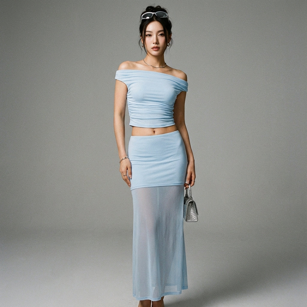 Afferma il tuo stile con il nostro completo due pezzi, composto da un top asimmetrico senza maniche e una gonna lunga aderente con inserti in rete. Un outfit elegante e moderno, perfetto per le occasioni speciali o per un look sofisticato di tutti i giorni! 💫