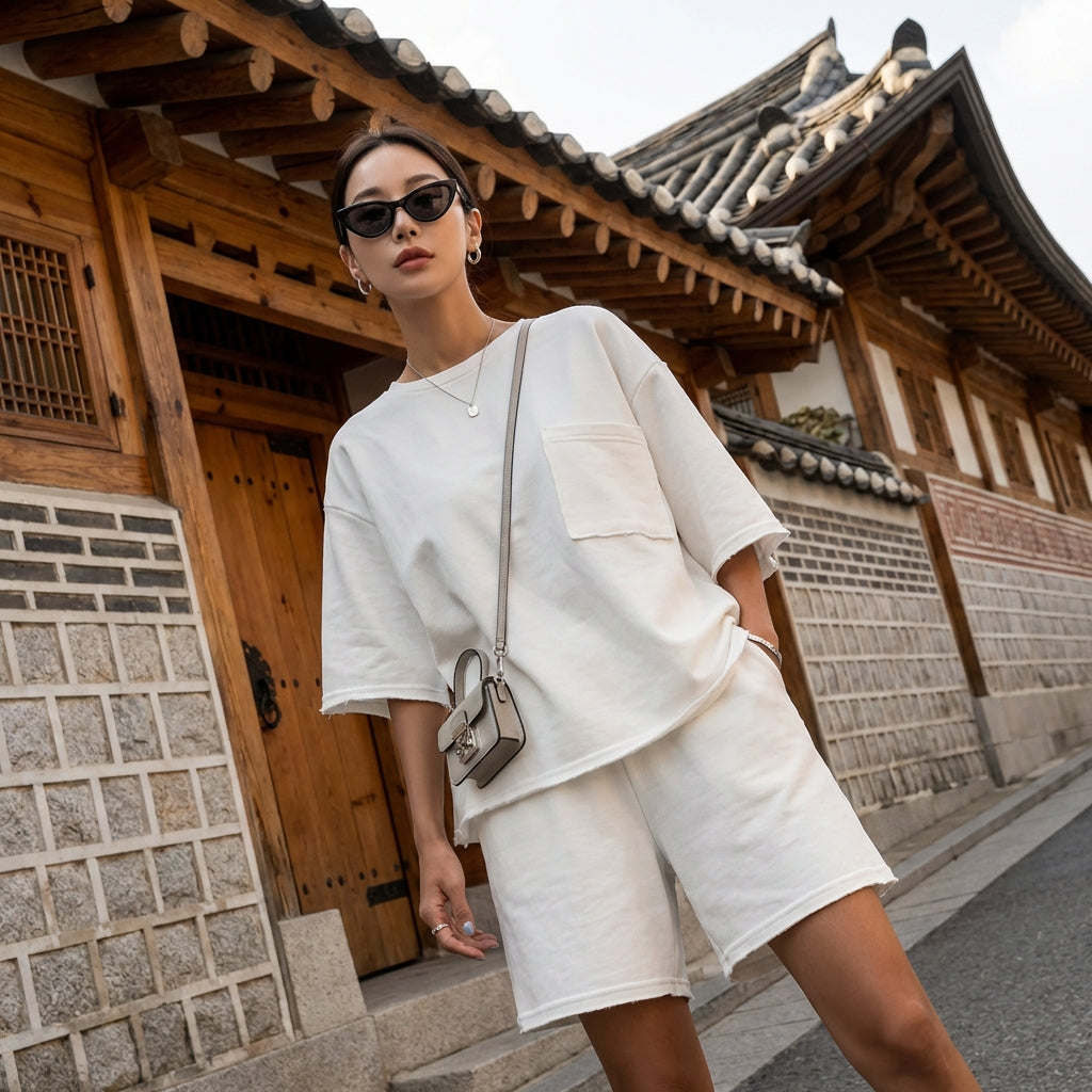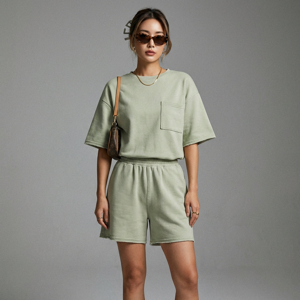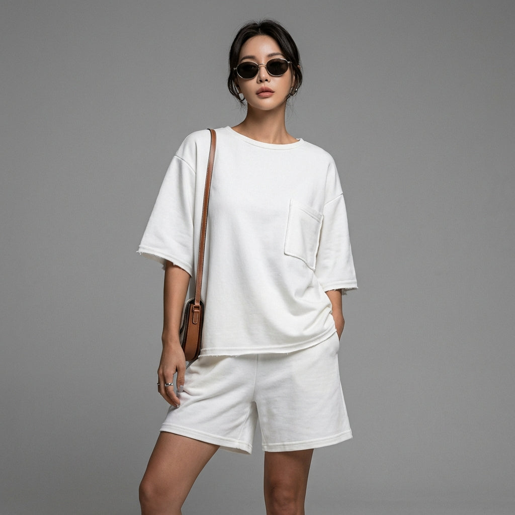 Scopri il nostro completo casual composto da un top a girocollo e maniche corte, accompagnato da shorts abbinati. Perfetto per un look estivo e confortevole, questo completo unisce semplicità e stile per le tue giornate di sole! ☀️