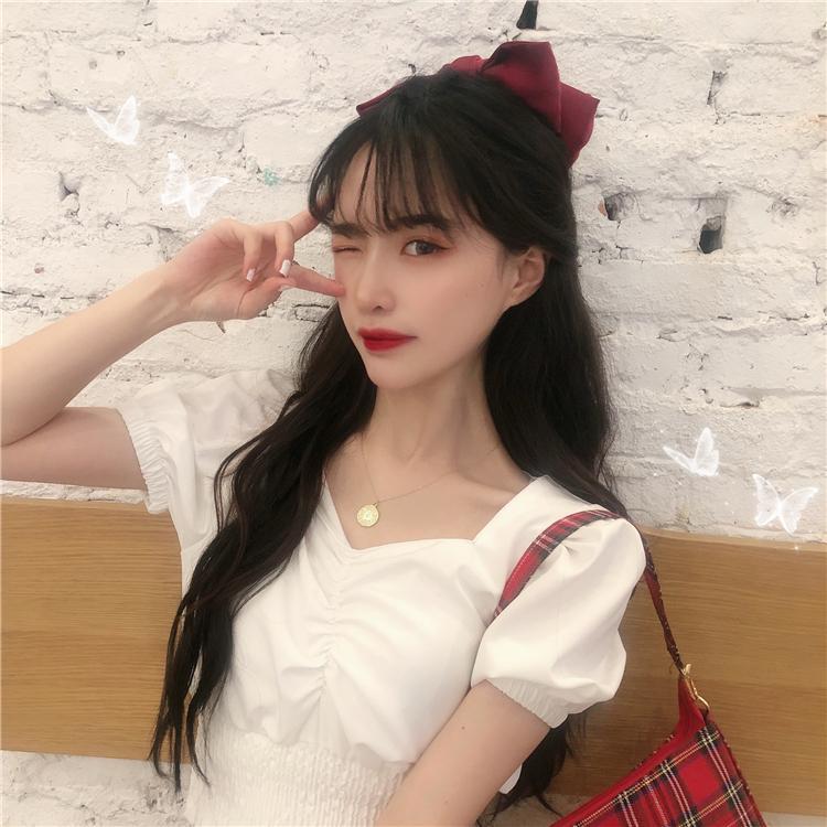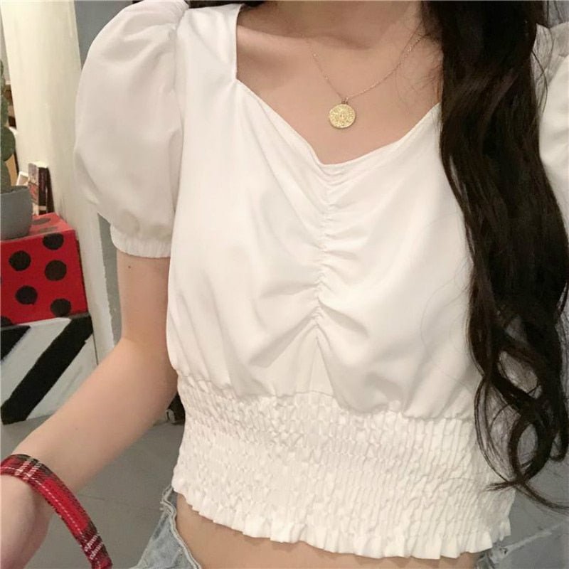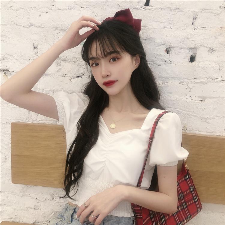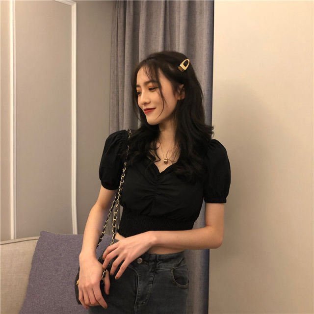 Se stai cercando un crop top vintage, questo modello di crop top coreano è perfetto. È un top puff, più largo sulla parte superiore delle braccia e sul petto. Dà un effetto retrò che piace molto nei caffè di Seoul.