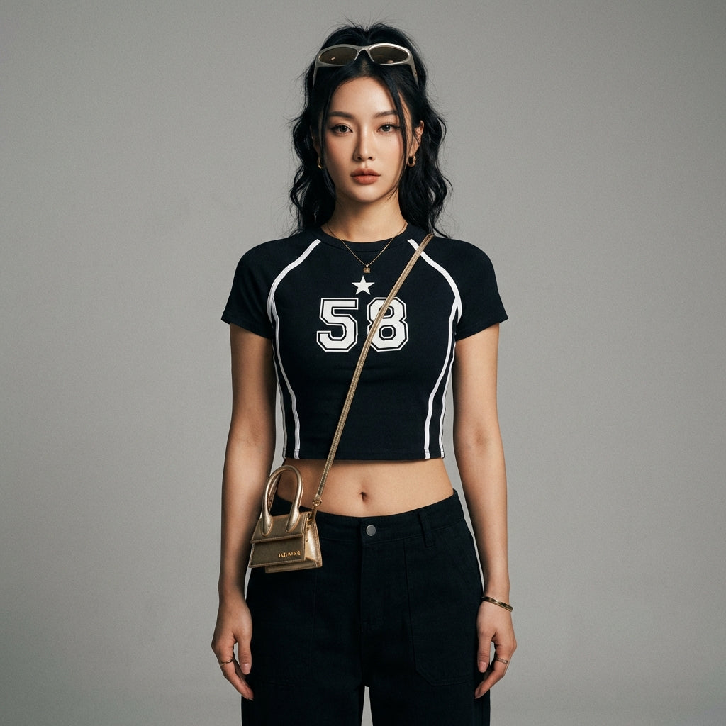 - Stile: Streetwear, K-fashion, Tendenza. Questo crop top incarna il dinamismo della moda urbana coreana, ideale per un look casual e alla moda.