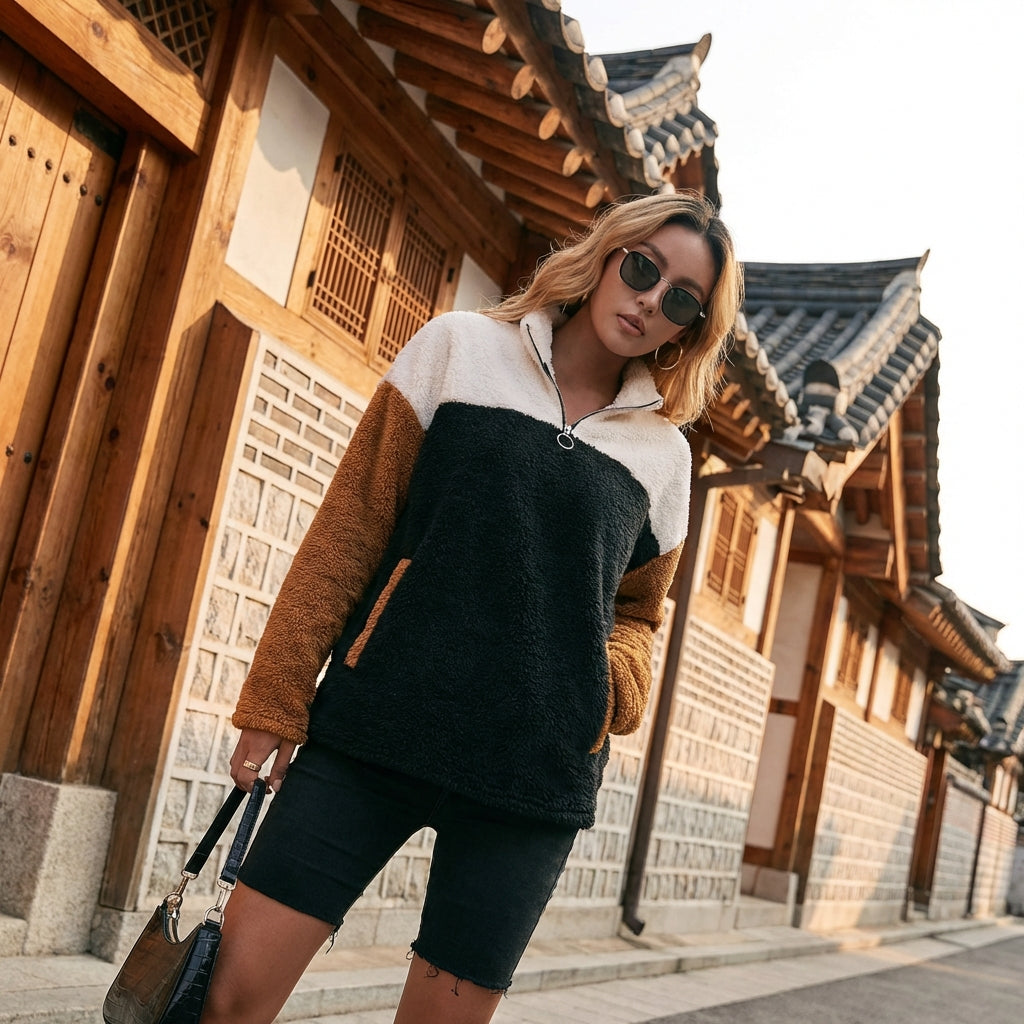 Adotta un look casual e alla moda con la nostra felpa con cappuccio in peluche bicolore. Questo capo accogliente combina comfort e stile con i suoi blocchi di colore a contrasto e la pratica tasca applicata. Perfetto per stare al caldo con un tocco di moda! 🌟