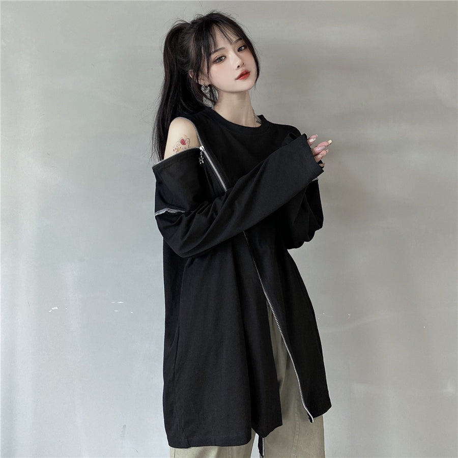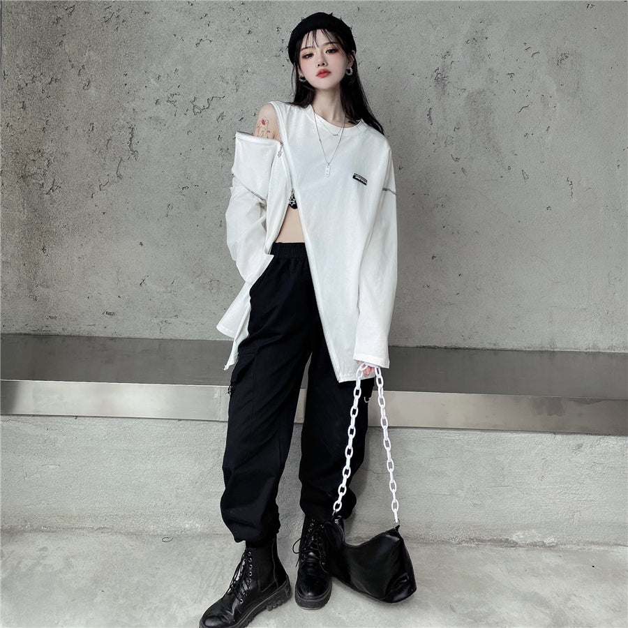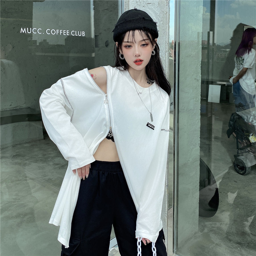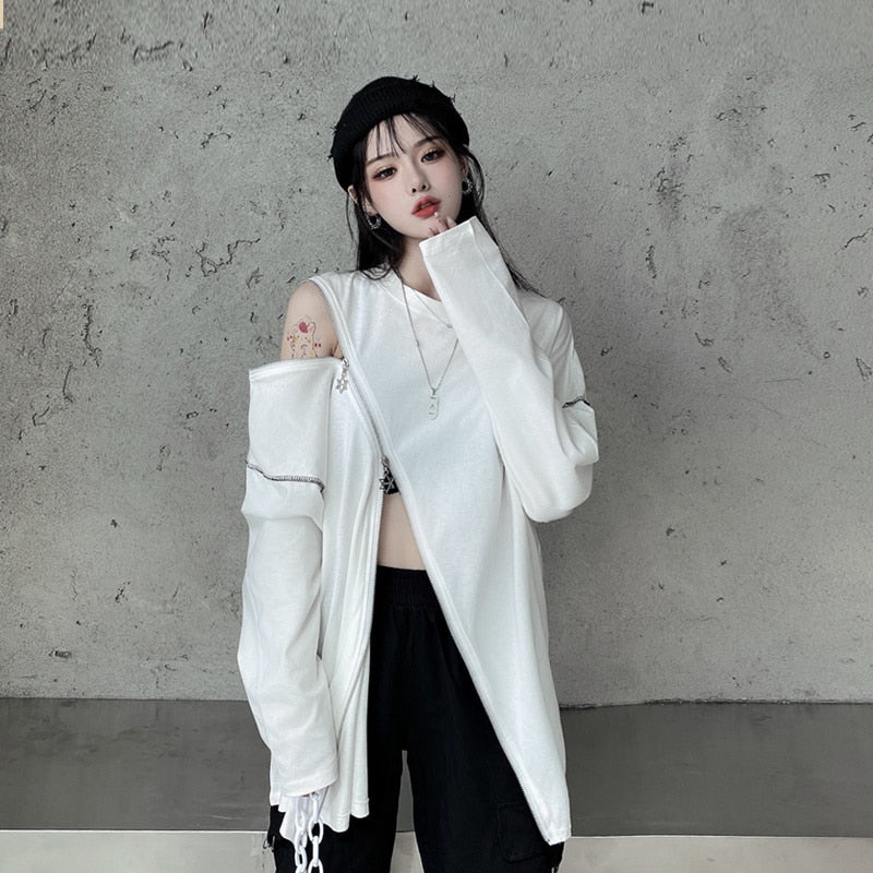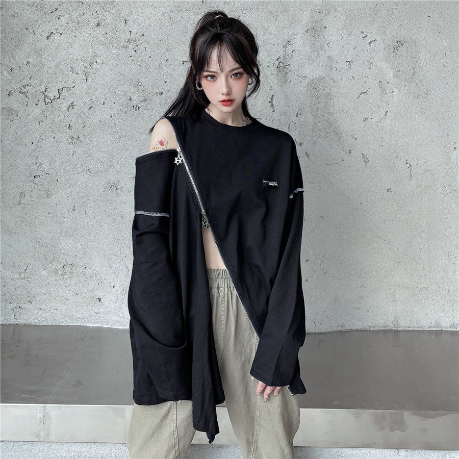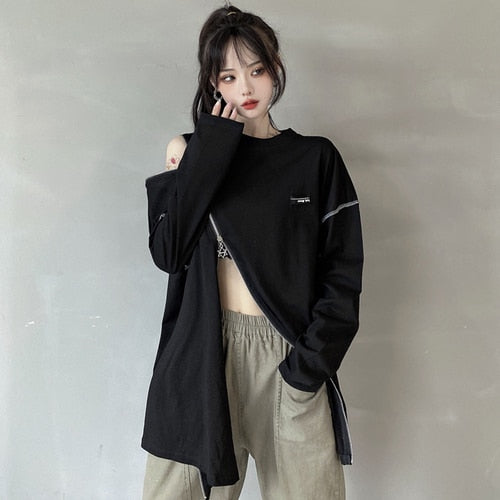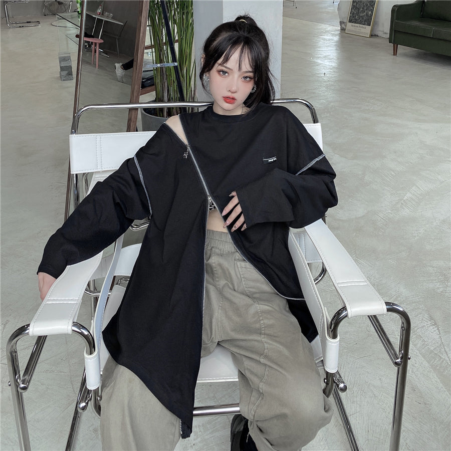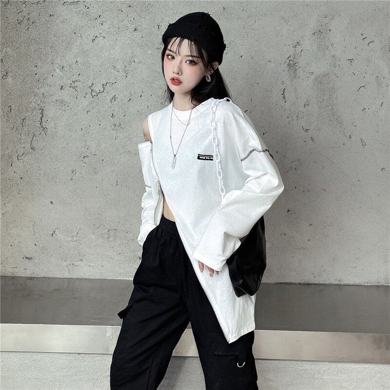 Questo maglione rappresenta l'asimmetria nella moda streetwear coreana. È una felpa che si apre all'altezza della pancia e della spalla. Può ricordare un crop top lungo. Questo maglione è disponibile in due colori e si apre con zip rapide.
